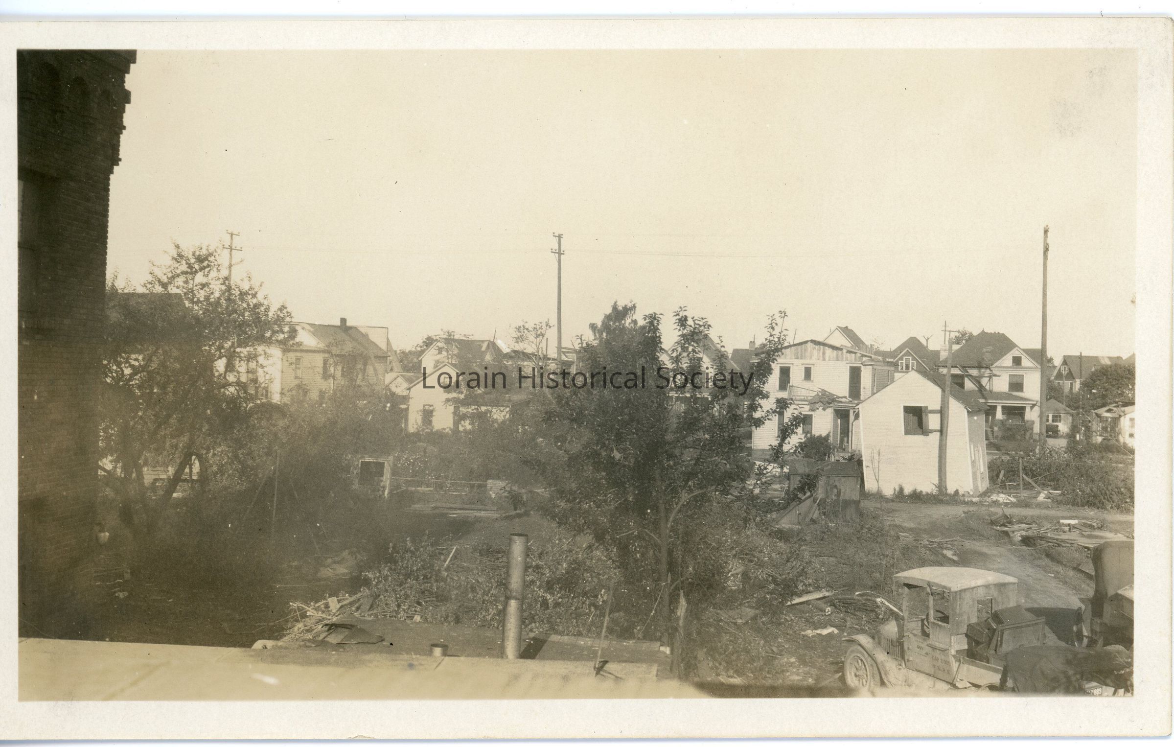Photograph is black and white view of unidentified houses showing damage and destruction from 1924 Tornado.