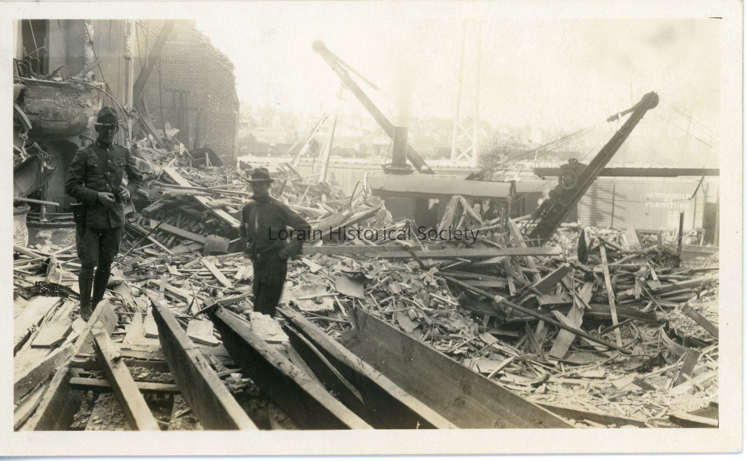 Photograph is black and white view of debris and ruins of the State Theatre, 375 Broadway, showing National Guardsman, worker and steam shovel cleaning up debris after 1924 Tornado.