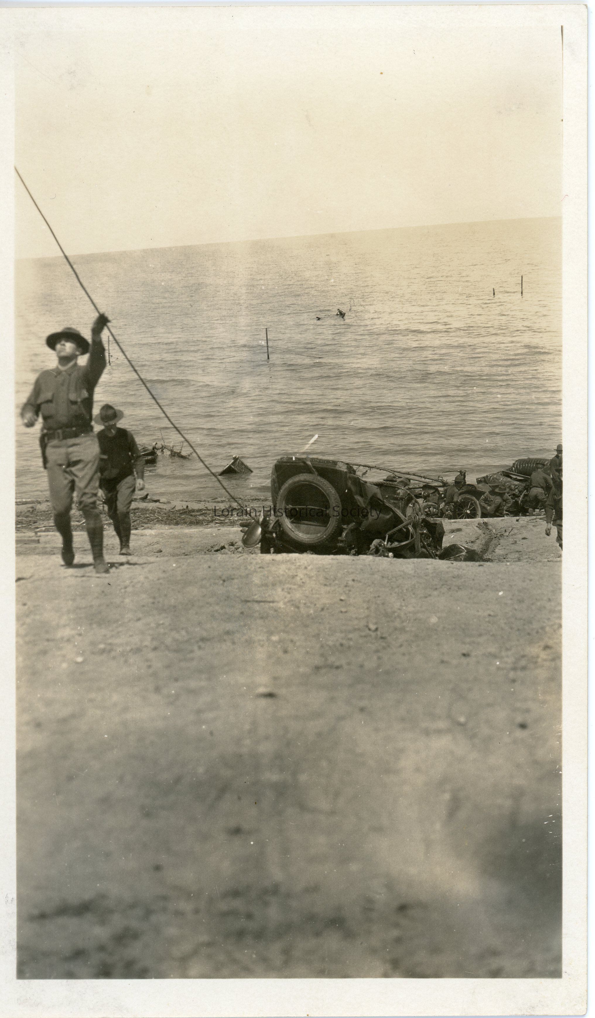 Photograph is black and white view of National Guardsmen removing automobiles near the Lakeview Bath House that were damaged and submerged during the 1924 Tornado.