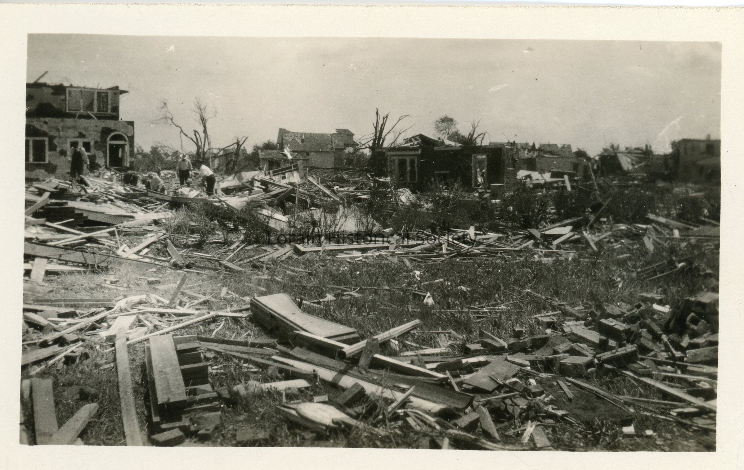 Photograph is black and white view of houses in Lakeview Allotment showing damage, destruction and debris from 1924 Tornado. House on left in background is 1408 West Erie Avenue, Minnie and Allison Babcock Home. The homes in the foreground are located on South Lakeview Boulevard and were completely destroyed. .Photograph Details