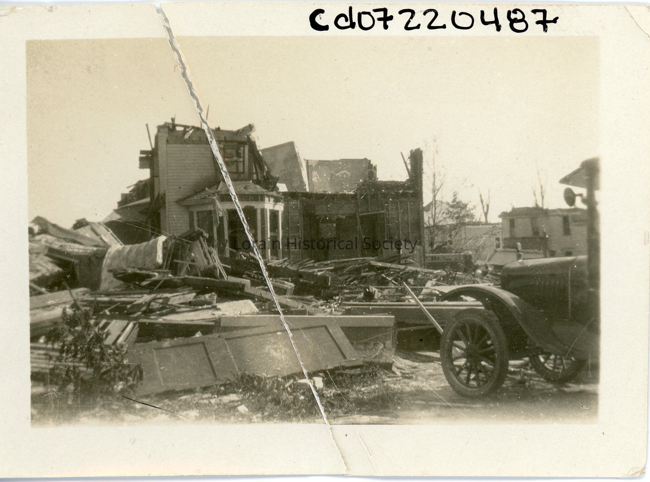 Photograph is black and white view of 1156 West Eighth Street, Clara and Edward Reidy Home showing damage, destruction and debris from 1924 Tornado. (Owner of Reidy Scanlon Funeral Home and Reidy Scanlon Furniture).Acquisition