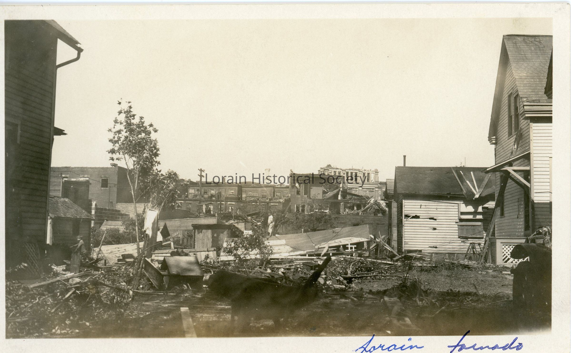 Photograph is black and white view of unidentified houses showing damage and destruction from the 1924 Tornado. The tall building in the background might be the Duane Building, 401 Broadway, with the roof torn off.Acquisition