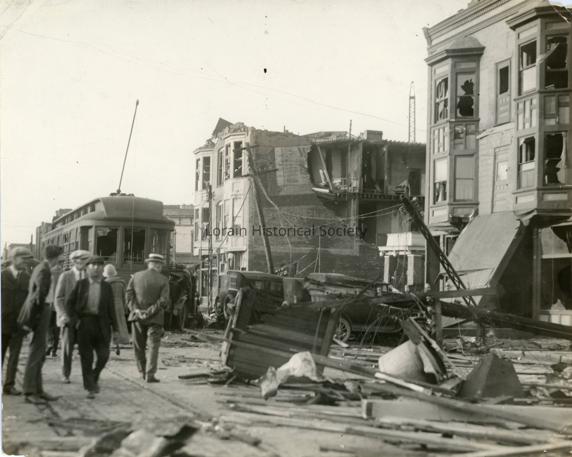 Photograph is black and white view of west side of Broadway/North Broadway showing damage and destruction from 1924 Tornado. Damaged streetcar is in front of Hotel Black. Man in straw hat with his hands behind his back is William N. Little, Real Estate Insurance and Bonding.