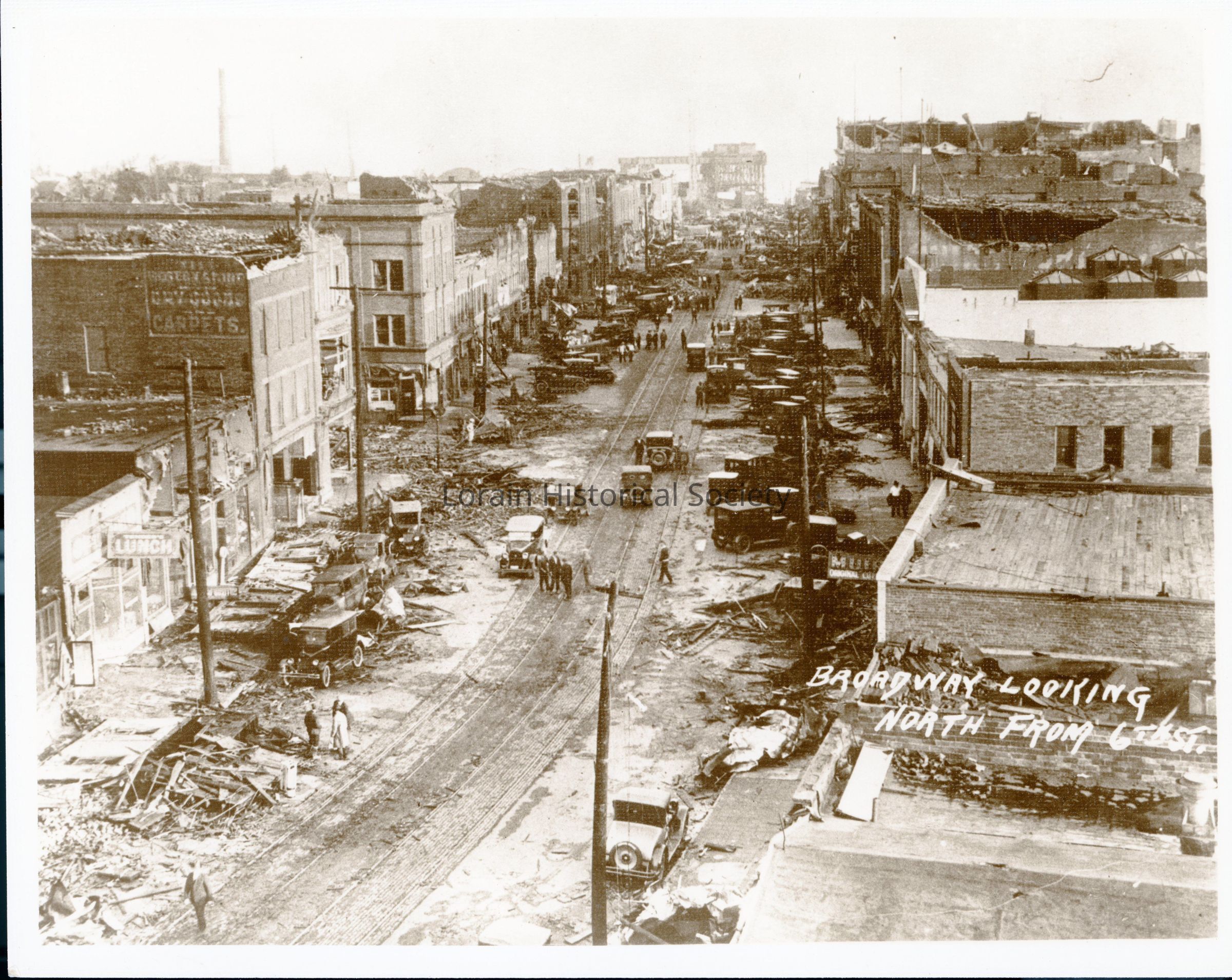 Photograph is black and white view of Broadway, looking north from West Sixth Street, showing damage, destruction and debris after the 1924 Tornado. Photograph was taken the day after the tornado on 6/29/1924 from the top of the Eagles Building.Photograph Details