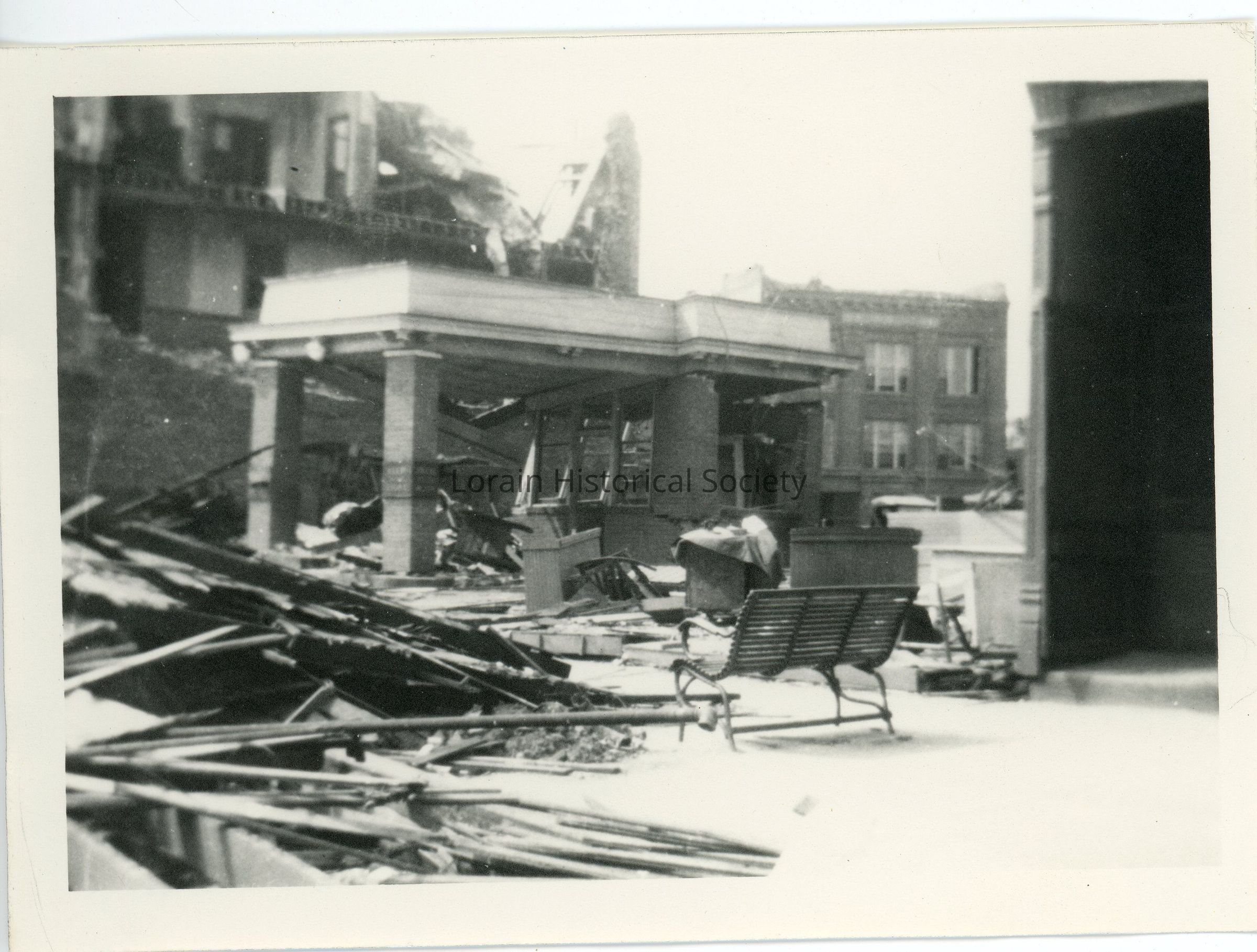 L to R: 280-282 Broadway, Hotel Black; 276 Broadway, Canfield Service Station; 272 Broadway, William C. Gage Restaurant (with debris in front); Lorain Police Station and Jail in background.Photograph Details