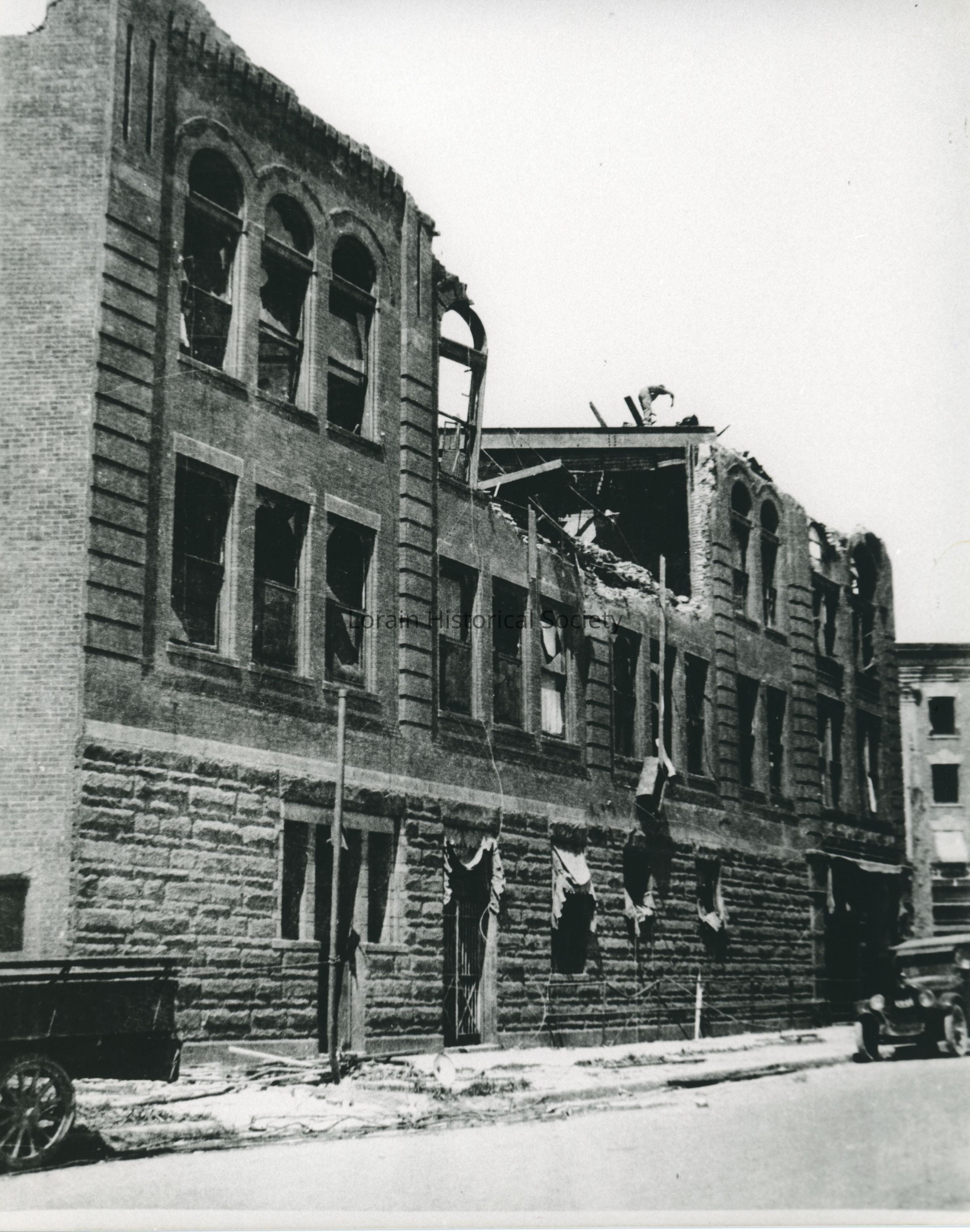 Photograph is black and white view of The Peoples Savings Bank, 374 Broadway, showing damage, destruction and debris from 1924 Tornado.