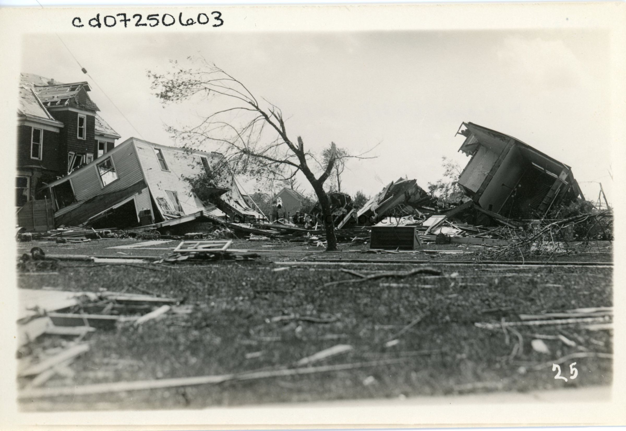 Photograph is black and white view of houses on West Fifth Street across from Victory Park showing destruction, damage and debris from 1924 Tornado.