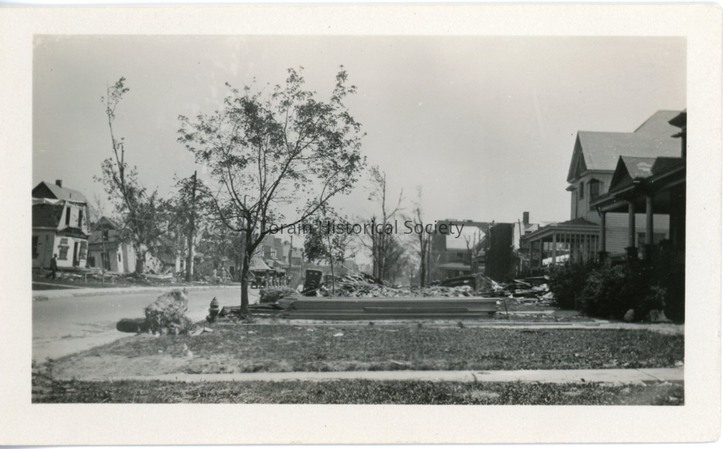 Photograph is black and white view of unidentified houses showing damage, destruction and debris from 1924 Tornado.Acquisition