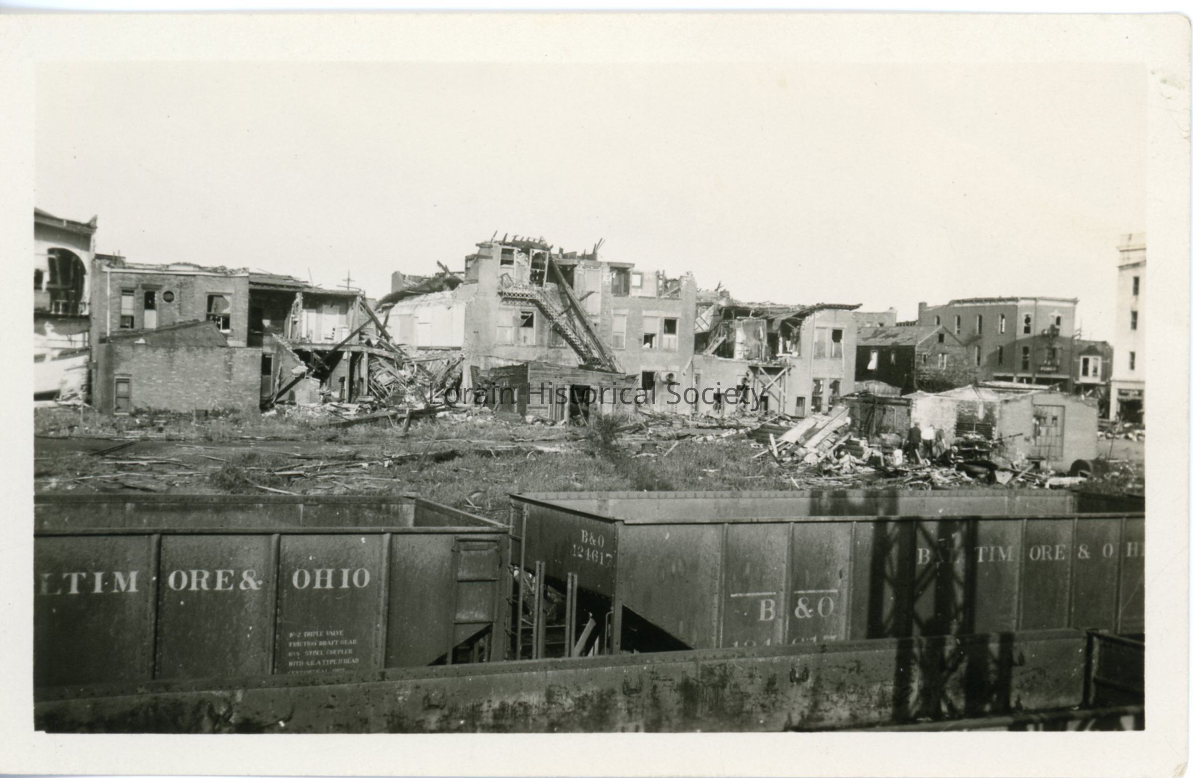 Photograph is black and white view of rear side of Broadway looking west from B&O Railroad tracks showing damage, destruction and debris from 1924 Tornado. Railroad cars in foreground. L to R: 675 Broadway, Masonic Hall; 677 Broadway, Lorain Market House, Market Candy Kitchen, William D. Gerber Delicatessen, Charles Catalano Fruits, Leo Greenwood Meats, Edward C. W. Lane Meats; 711 Broadway, Griffin's Art Store; 713 Broadway, Frank G. Carek Florist; 715 Broadway, Home Supply Store; 717 Broadway, Independent Savings and Loan.Photograph Details