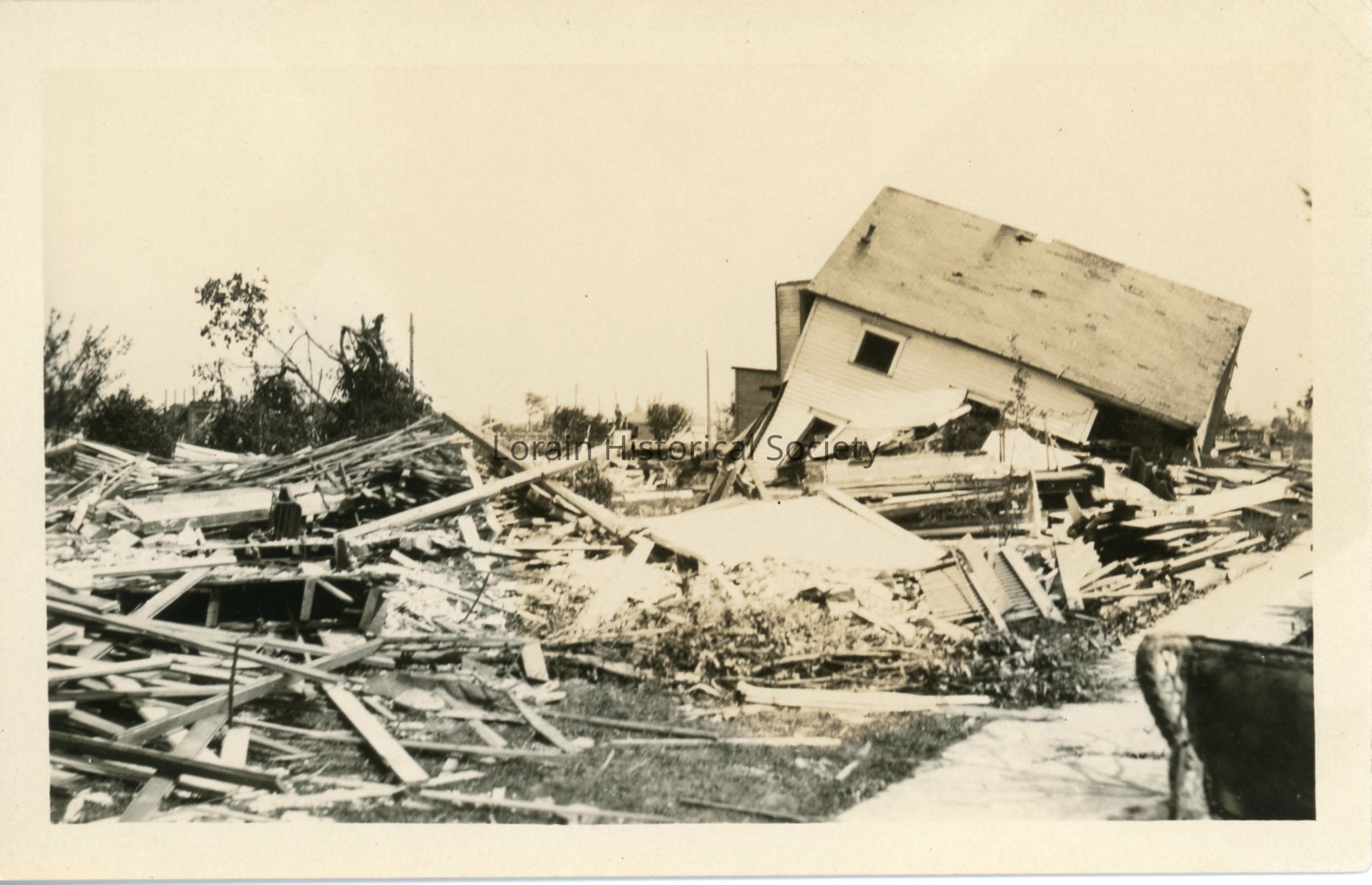 Photograph is black and white view of unidentified houses showing destruction and debris from 1924 Tornado.Acquisition