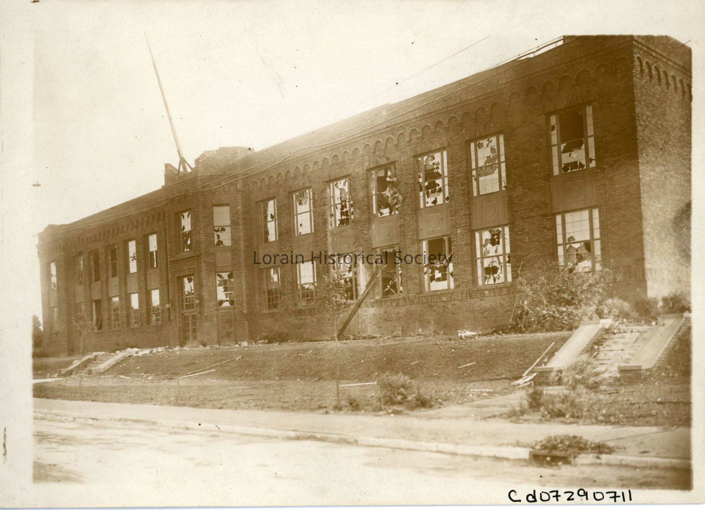 Photograph is black and white view of Irving School, West Fourth Street and Hamilton Avenue, showing damage from 1924 Tornado. Photograph taken on 6/28/1924.Photograph Details