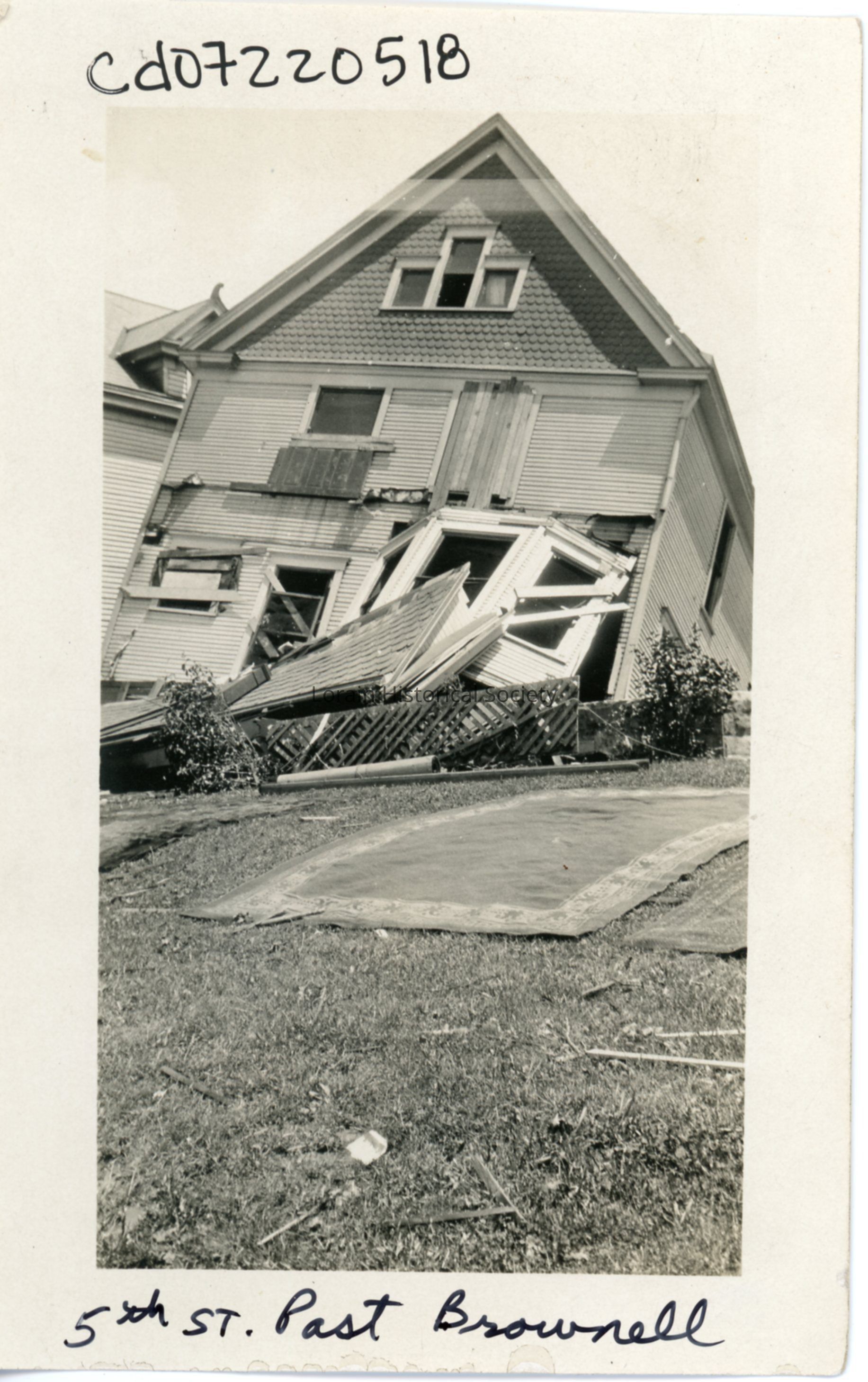 Photograph is black and white view of unidentified house on West Fifth Street, past Brownell Avenue, showing damage and destruction from 1924 Tornado.Photograph Details