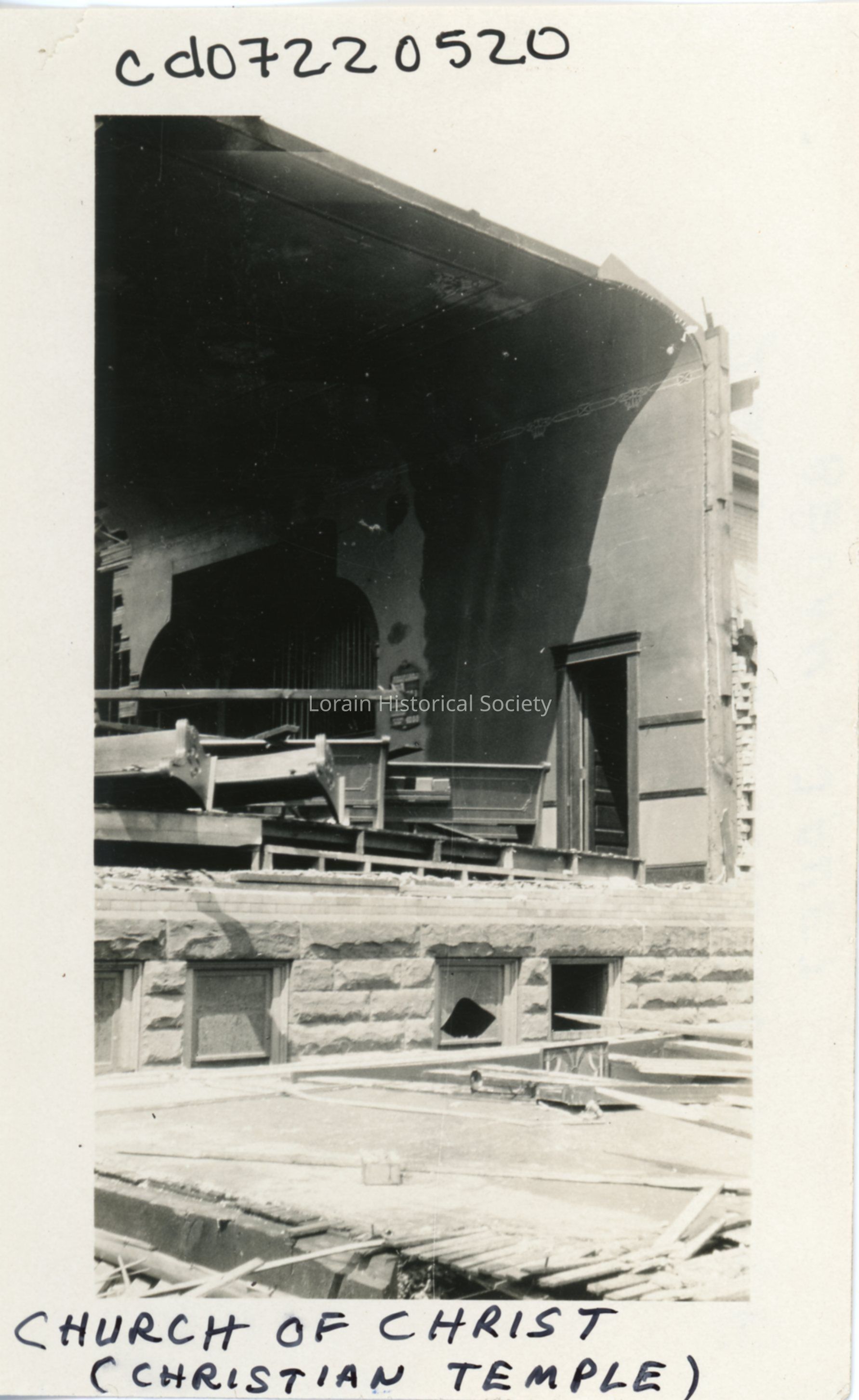 Photograph is black and white view of First Church of Christ, 210 West Fifth Street, showing destruction from 1924 Tornado. It late became Christian Temple.Photograph Details