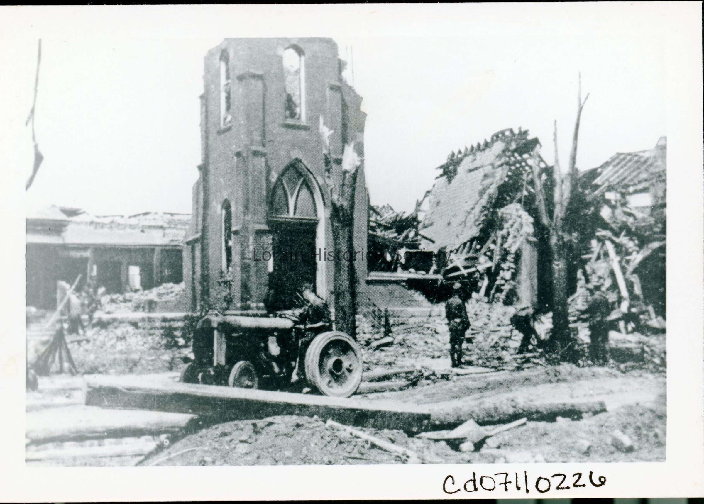 Photograph is black and white view of Emmanual Evangelical Church, corner of West Sixth Street and Reid Avenue, showing destruction from 1924 Tornado.Acquisition