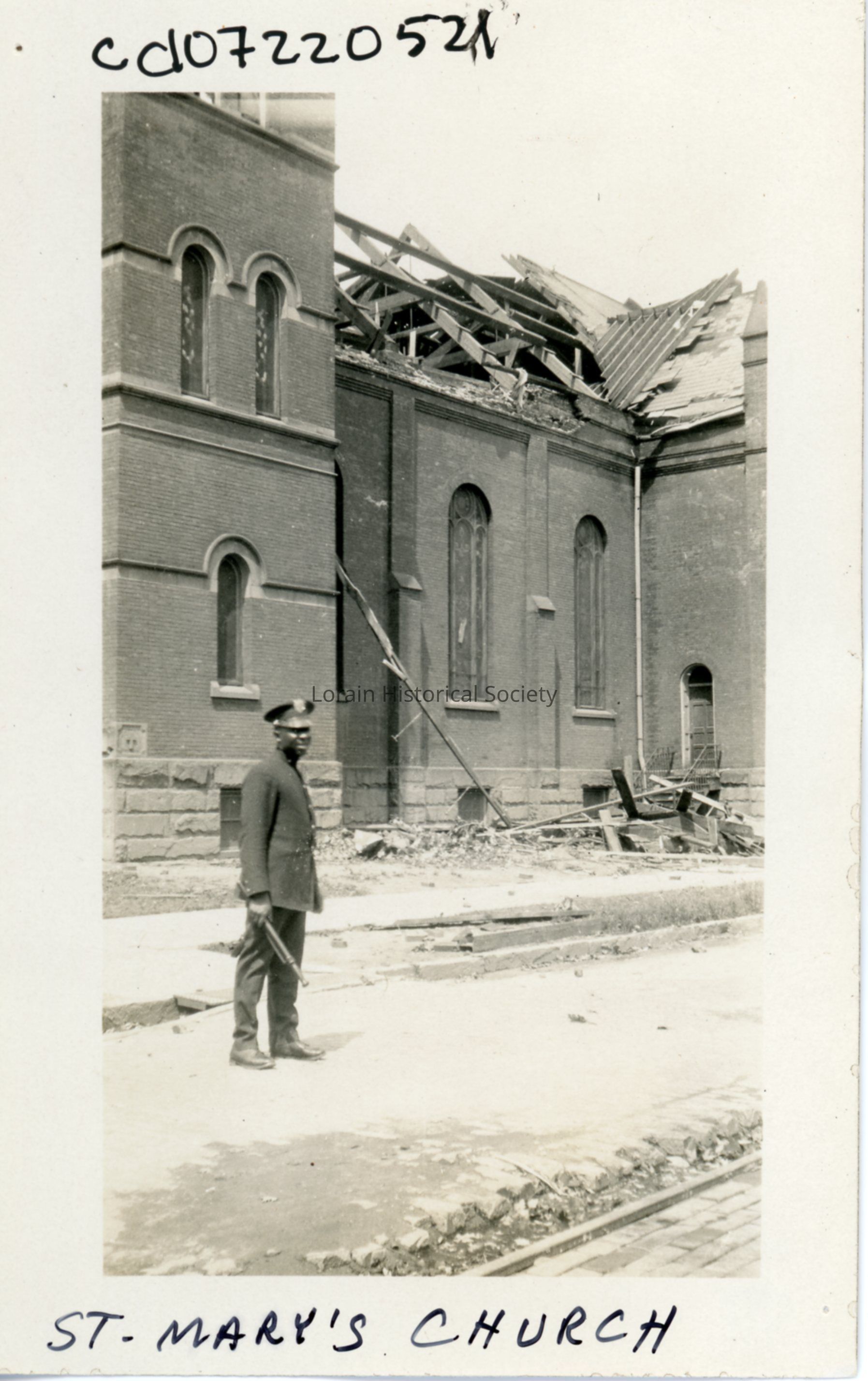 Photograph is black and white view of St. Mary's Catholic Church, 300 West Eighth Street, showing destruction, damage and debris from 1924 Tornado. Unidentified police officer standing in front.Photograph Details