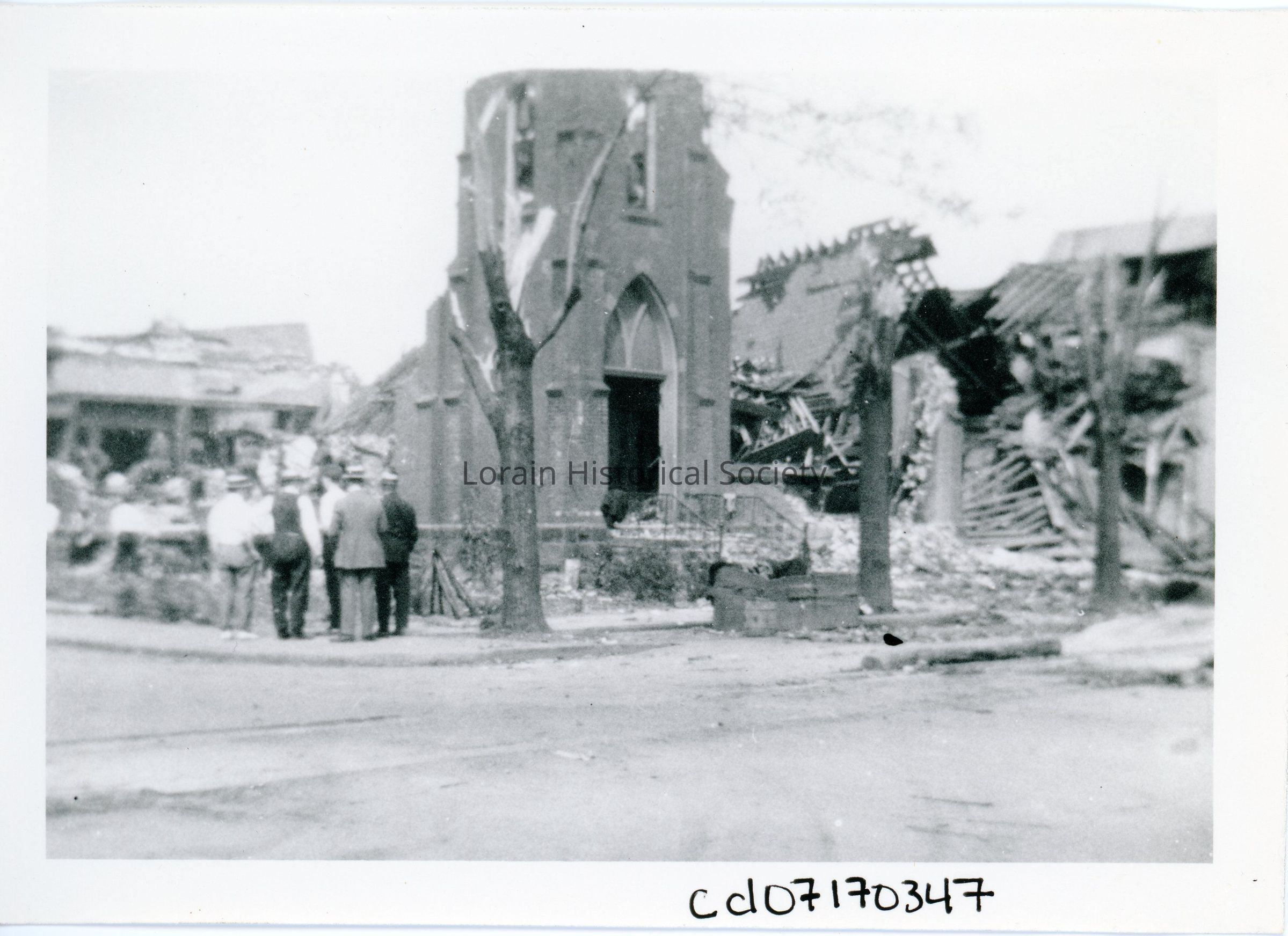 Photograph is black and white view of Emmanual Evangelical Church, NW corner of West Sixth Street and Reid Avenue, showing damage and destruction from 1924 Tornado.Acquisition