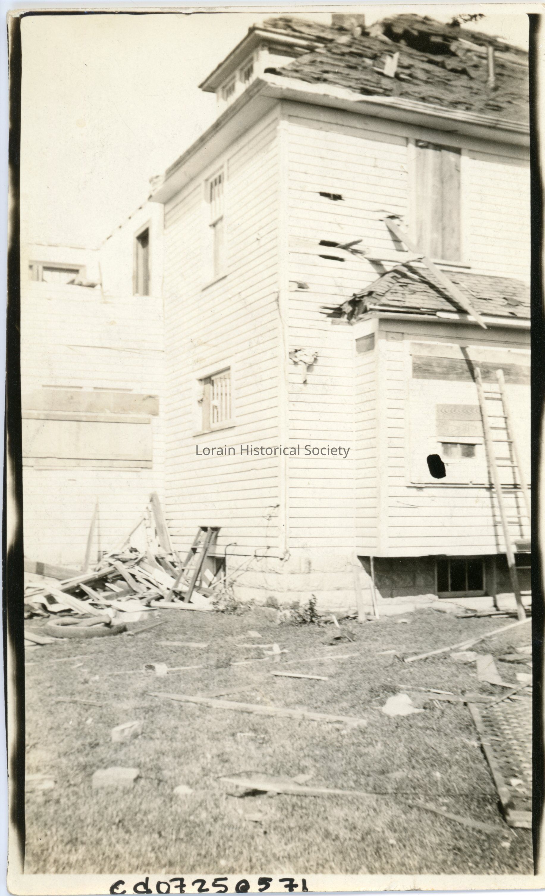 Photograph is black and white view of unidentified house showing damage and destruction from 1924 Tornado. (This house might be located in Lakeview Allotment).Collection