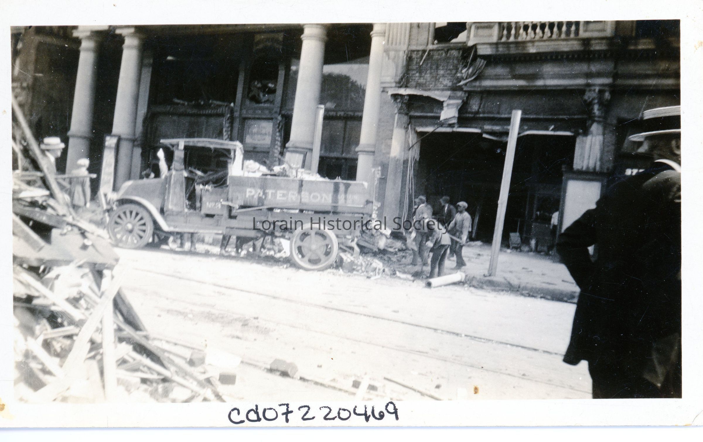 Written on back of photograph: "Cleaning up in front of the State theatre where many were killed and wounded."Acquisition