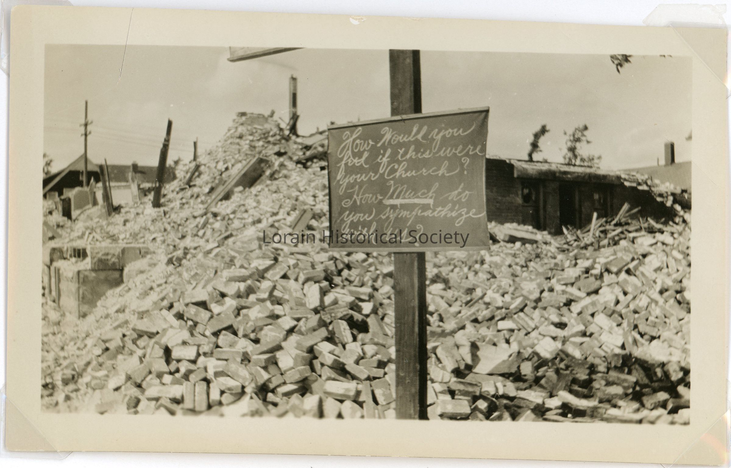 Photograph is black and white view of sign posted in front of rubble and debris that reads "How would you feel if this was your Church? How much do you sympathize with us?" Church is unidentified, but might be Delaware Avenue ME Church, 658 East Erie Avenue (corner of Delaware Avenue and East Erie Avenue) as it was one of two churches that were completely destroyed by the 1924 Tornado.Acquisition