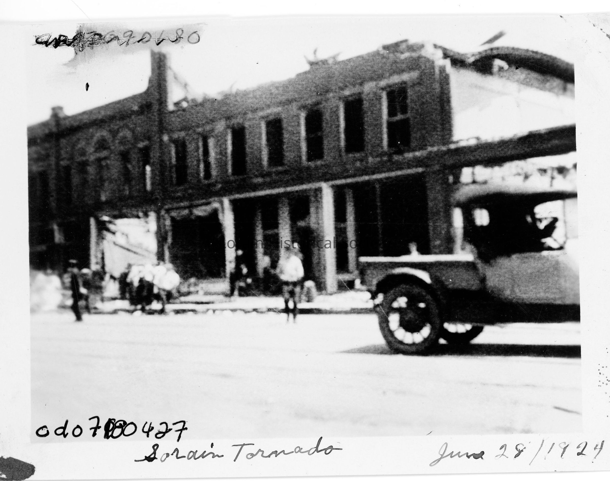 Photograph is black and white view of Broadway, June 29, 1924, showing damage and destruction from 1924 Tornado.
