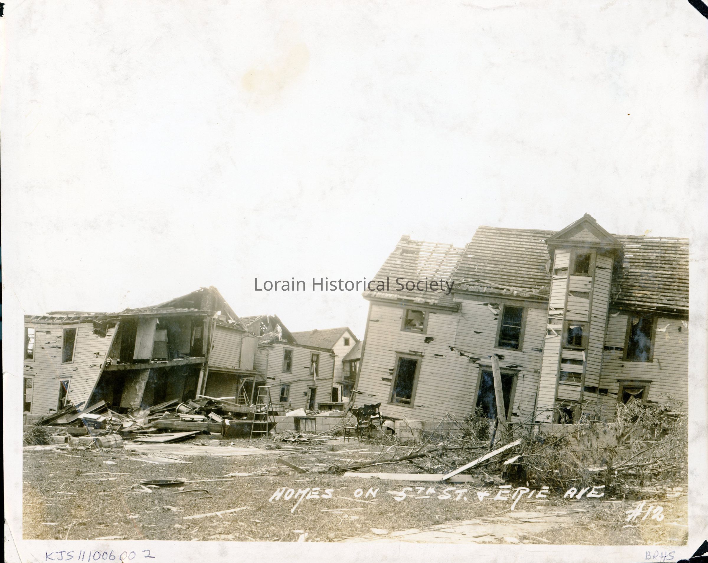 Photograph is black and white view of unidentified houses on West Fifth Street and West Erie Avenue showing destruction and debris from 1924 Tornado.