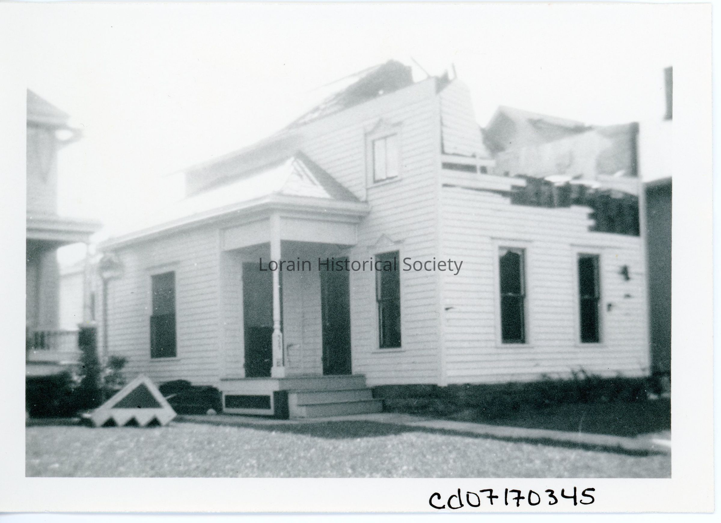 Photograph is black and white view of 527 Washington Avenue, Clara and Harley Redfied Home, showing damage and destruction from 1924 Tornado.Acquisition