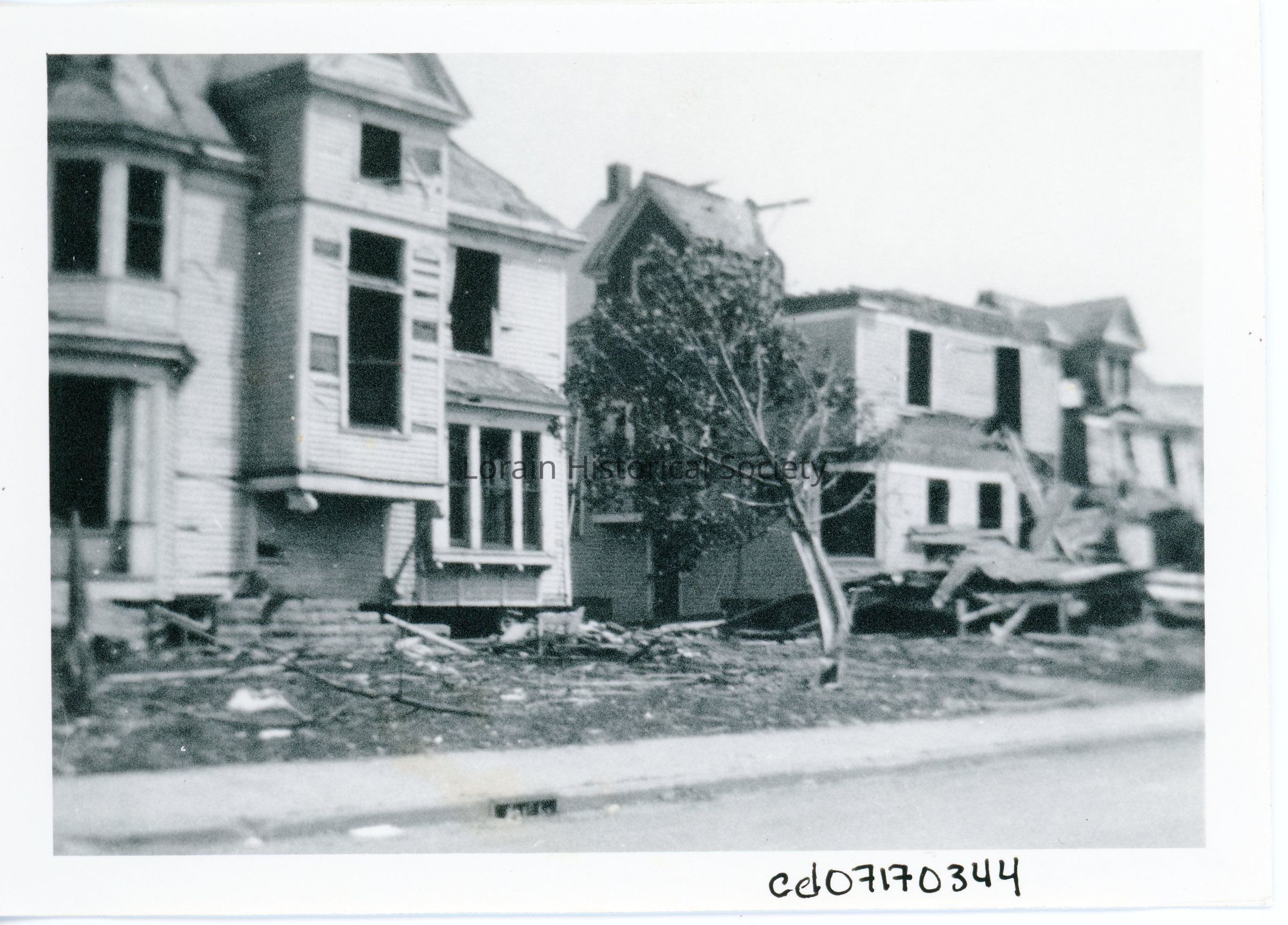 Photograph is black and white view of houses, ,might be West Fifth Street, showing damage from 1924 Tornado.Acquisition