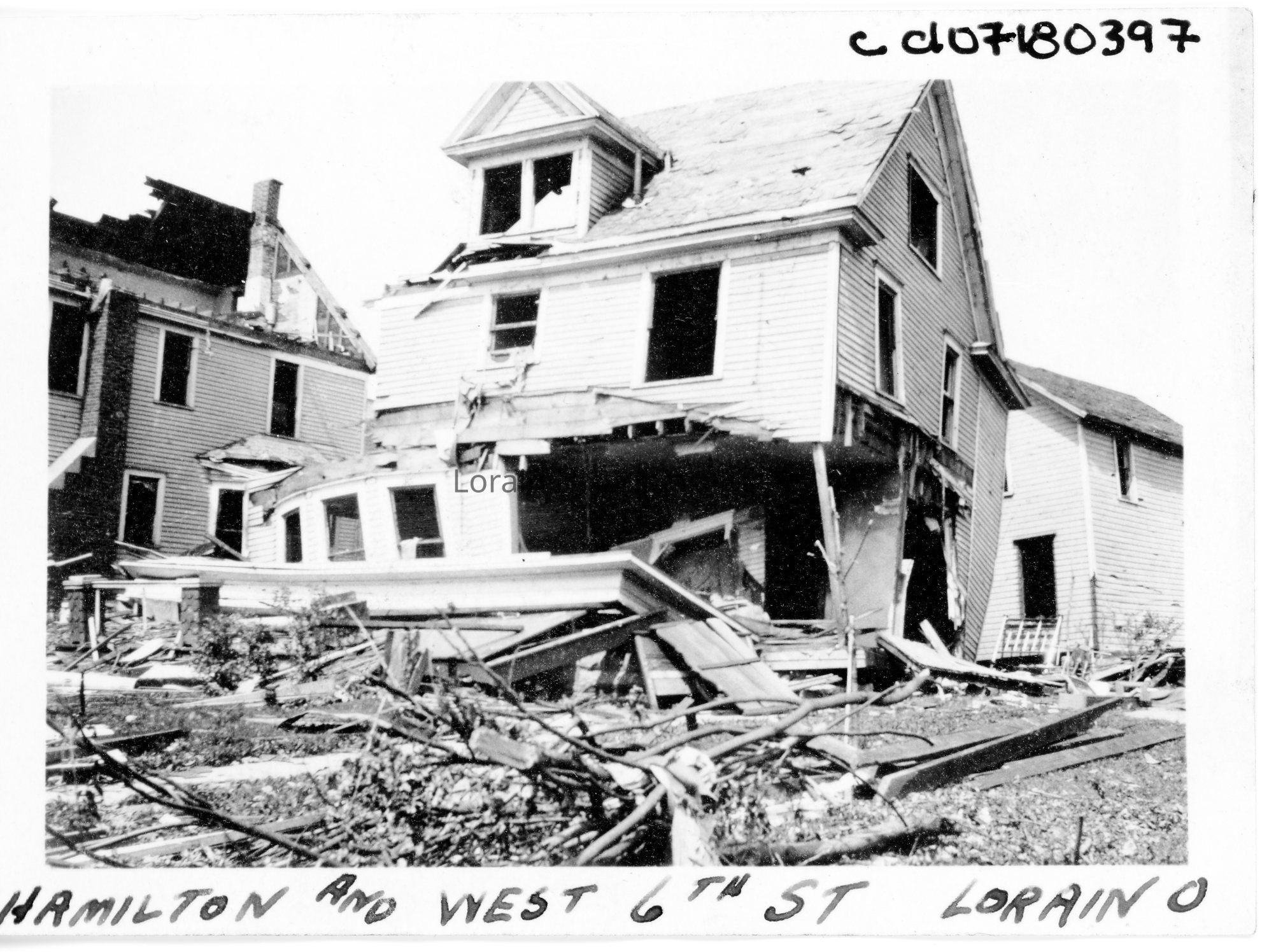 Photograph is black and white view of houses on Hamilton Avenue and West Sixth Street damaged by 1924 Tornado. L to R: 517 Hamilton Avenue, Lynola and Edward Lyons Home; 527Hamilton Avenue, Mattie and Andrew A. Braun Home; 529 Hamilton Avenue, Elizabeth and Thomas Walters Home.Acquisition