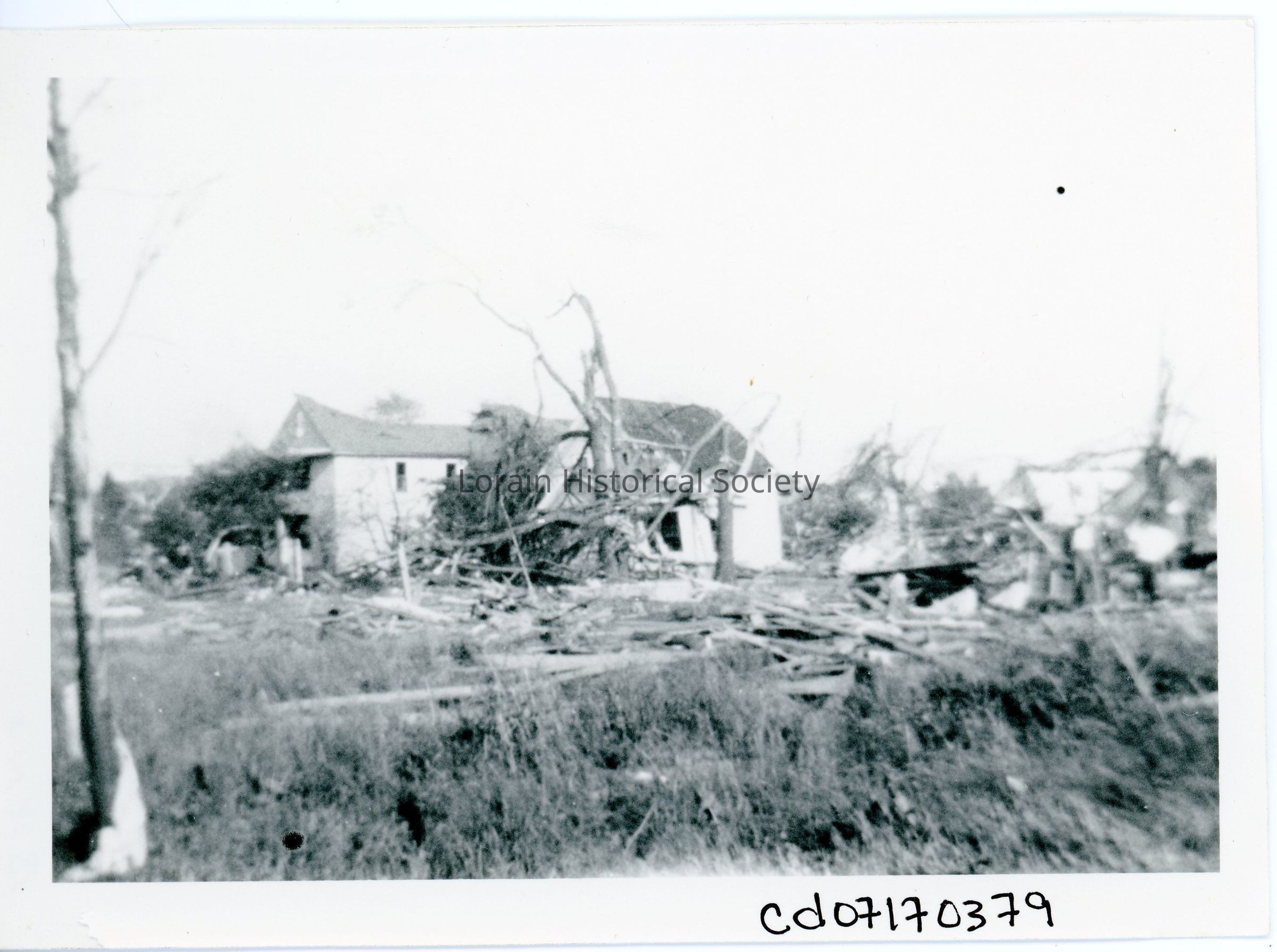 Photos of Lorain Tornado -- Photograph is black and white view of undentified houses showing damage and destruction from 1924 Tornado. (Might be East Side, Florida Avenue?).Acquisition