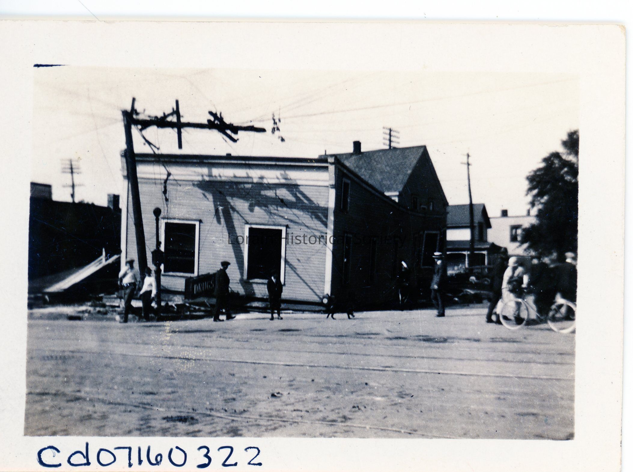 Photograph is black and white view of Jameson's Pharmacy, 450 East Erie Avenue, showing damage from 1924 Tornado.Acquisition