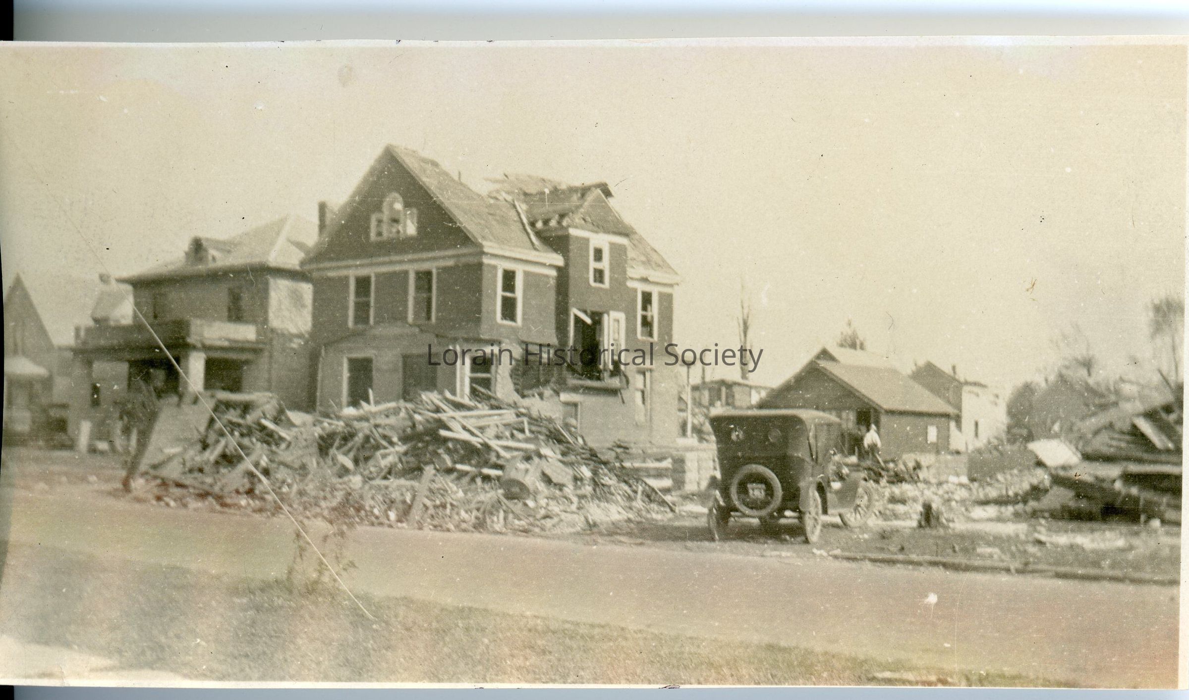 Photograph is black and white view of homes on West Fifth Street near the intersection of West Erie Avenue showing damage and destruction from 1924 Tornado. L to R: 1315 West Fifth Street, Amelia and Lloyd Kinney Home; 1319 West Fifth Avenue, Beatrice and Custer Snyder Home; 1321 West Fifth Street, Maud and William H. Baumbaugh Home; 1325 West Fifth Street. Eloizabeth S. and Franklin H. Williams Home.Acquisition