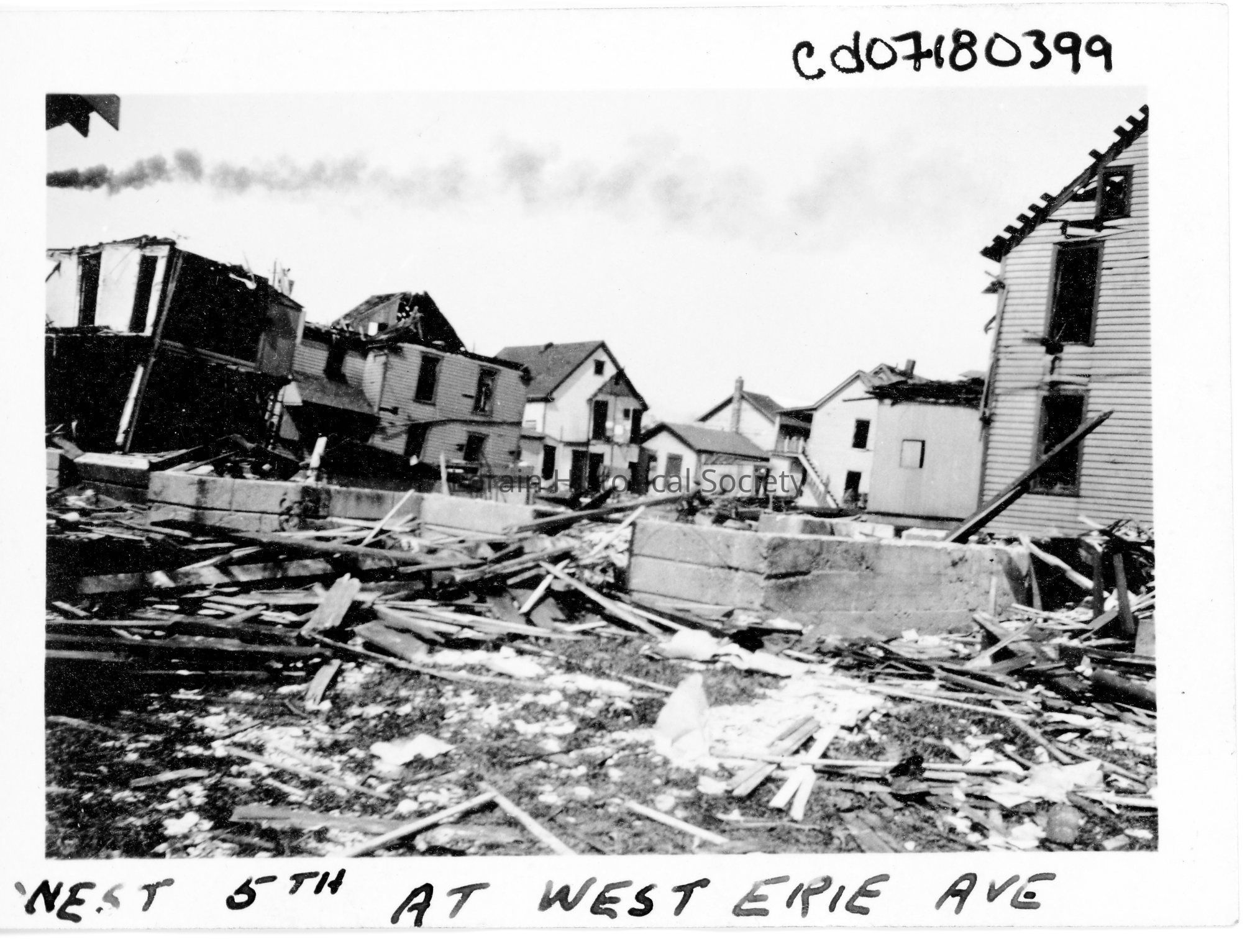 Photograph is black and white view of houses on West Fifth Street and West Erie Avenue showing damage and destruction from 1924 Tornado. L to R: 1031 West Erie Avenue, Charles C. Ellis Home; 1027 West Erie Avenue, Nellie and Edwin Kingsley Home; 1023 West Erie Avenue, Grace and Frank Klaer Home; 1019 West Erie Avenue, Eva and Albert Smith Home; Unidentified home; 1026 West Fourth Street, Mrs. Ida Jaycox Home.Acquisition