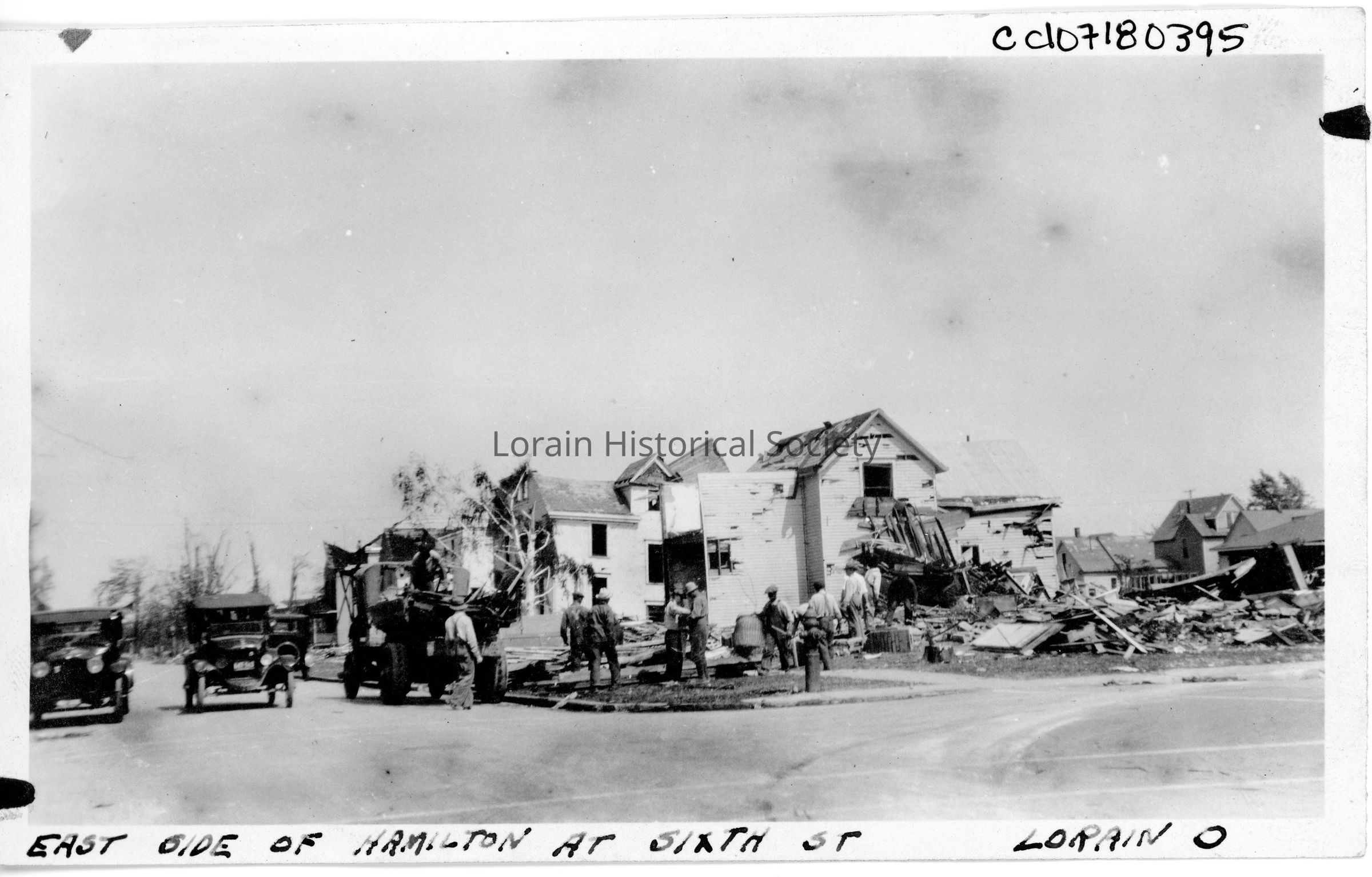 Photograph is black and white view of the east side of Hamilton Avenue at West Sixth Street showing damage and destruction from 1924 Tornado.Acquisition