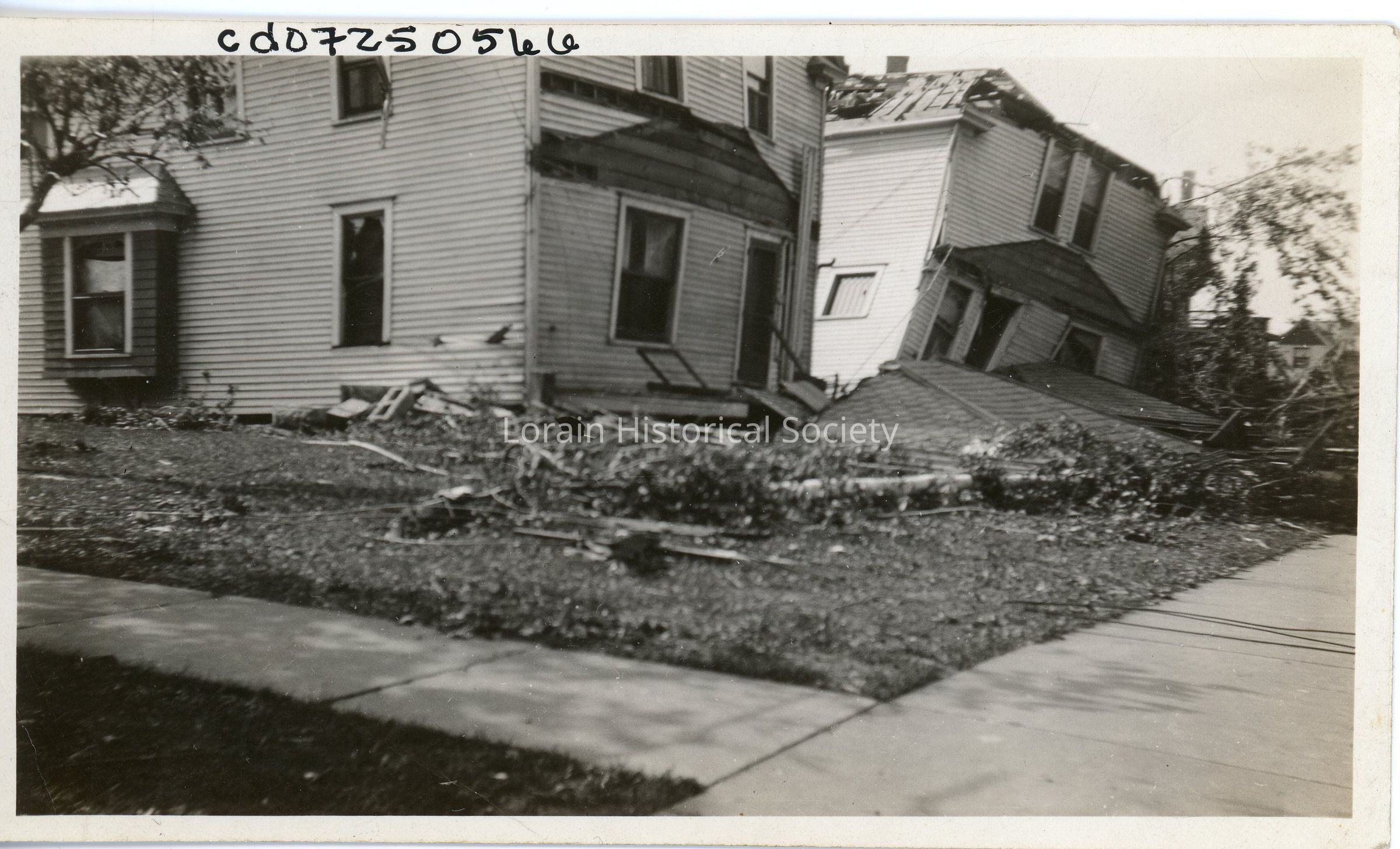 Photograph is black and white view of houses on West Erie Avenue, between Oberlin Avenue and Lake Place, showing damage and destruction from 1924 Tornado.