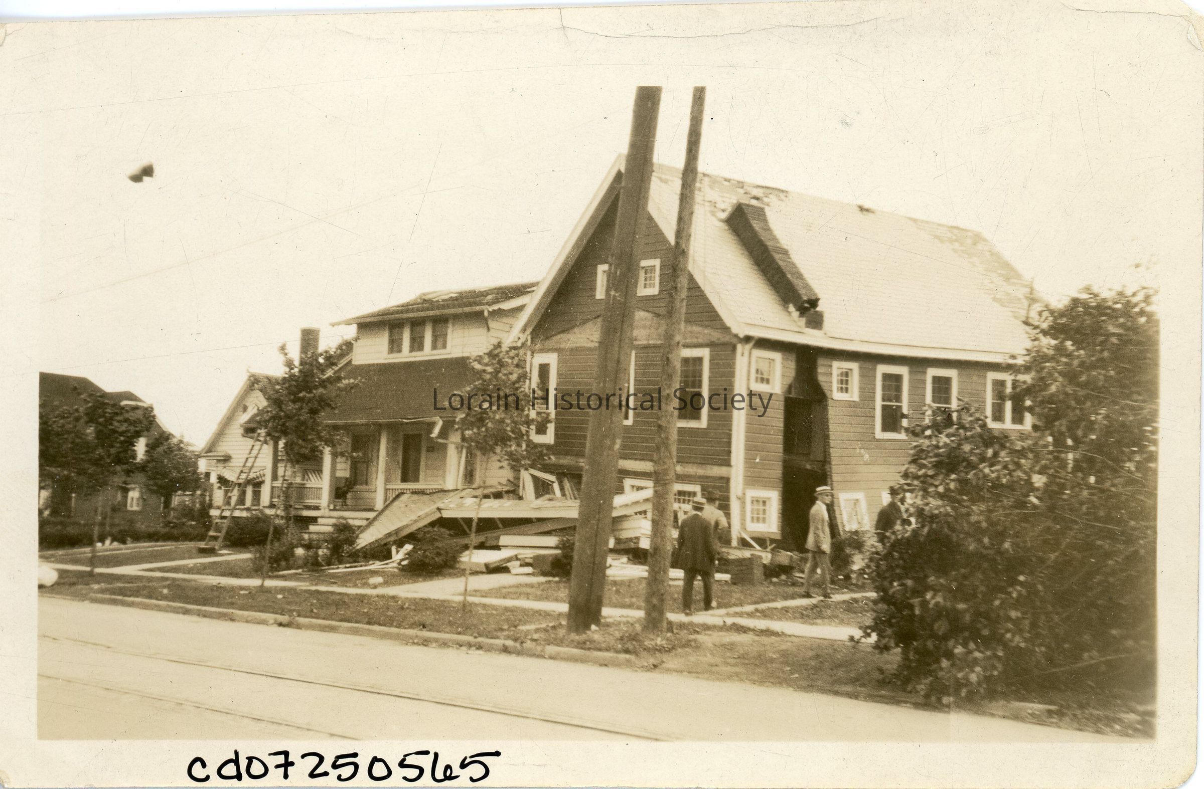 Photograph is black and white view of houses on Allison Avenue showing damage, destruction and debris from 1924 Tornado.