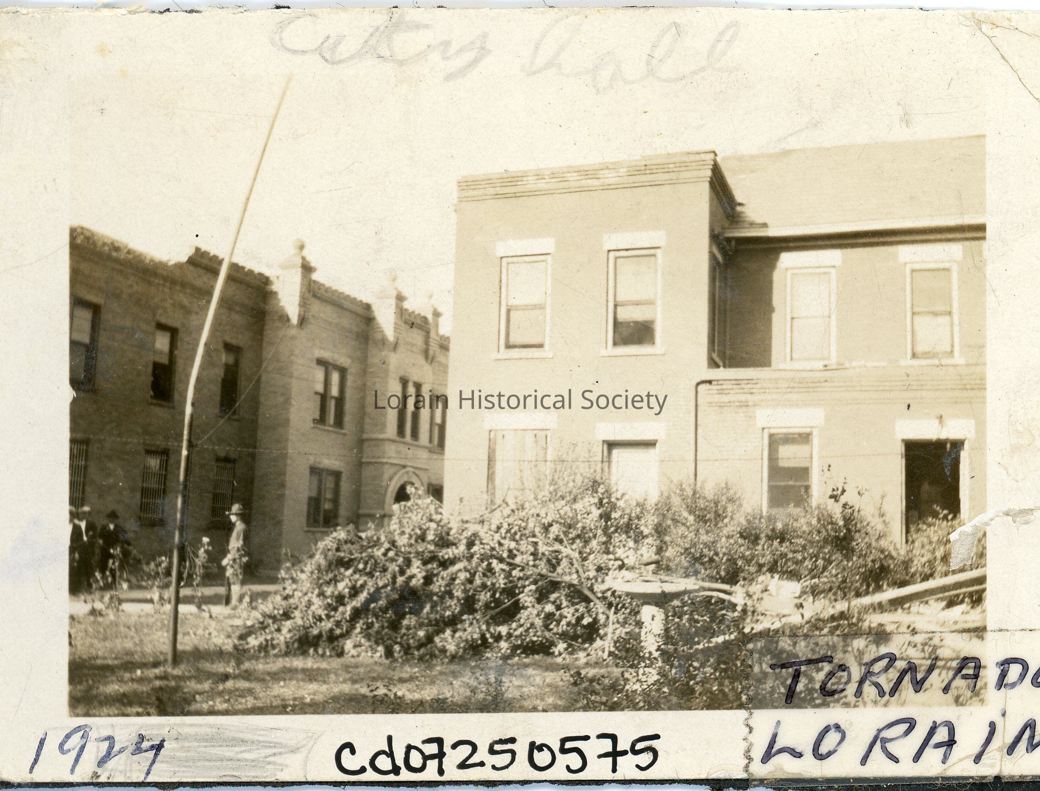Photograph is black and white view of Lorain Police Station and City Hall, 500 West Erie Avenue, showing damage from 1924 Tornado to west side rear of building.Acquisition