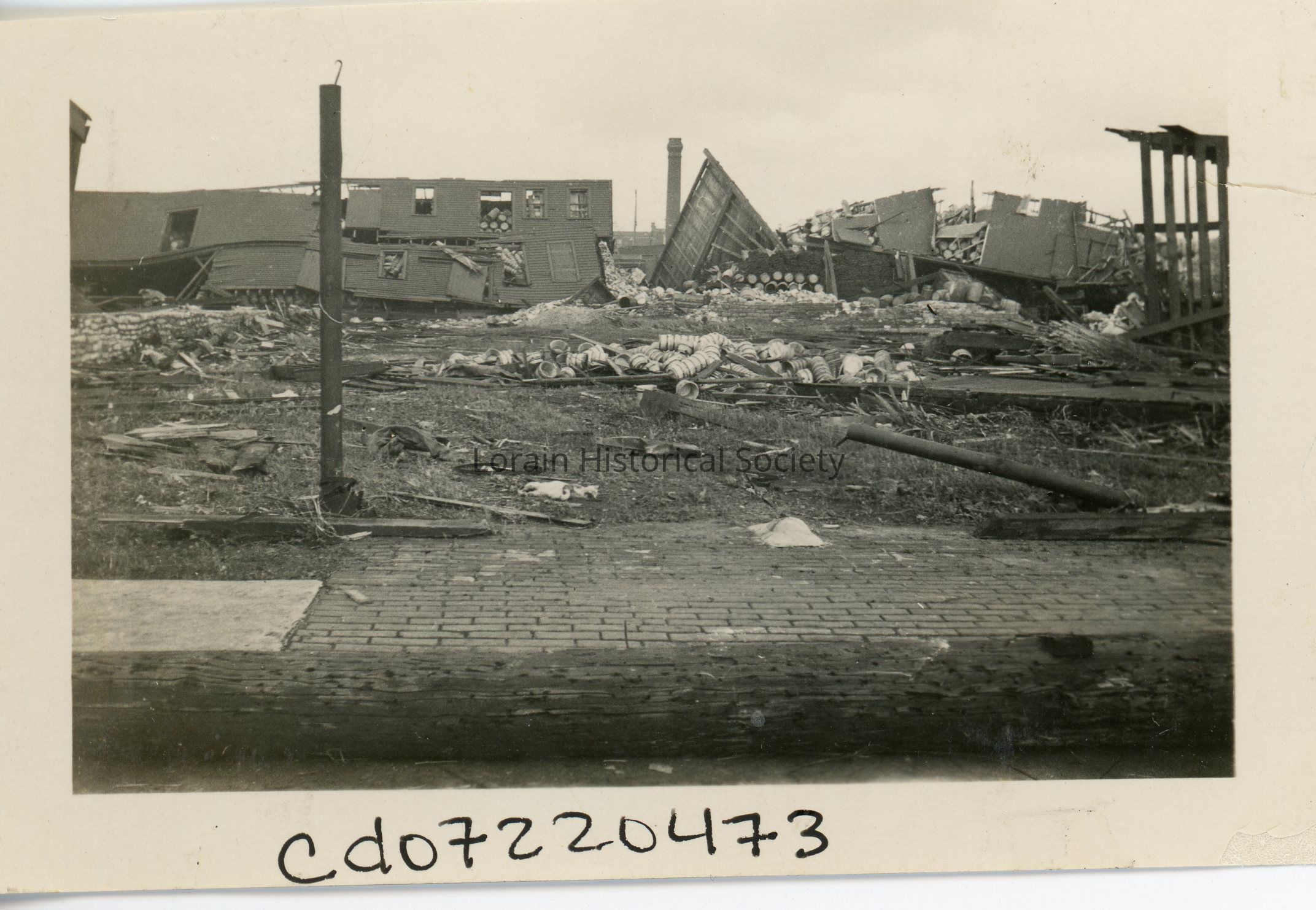 Photograph is black and white view of damage at American Shipyards where barrels from Kilbourn Cooperage Company in Sandusky, Ohio (35 miles away) were dropped by the 1924 Tornado.Acquisition