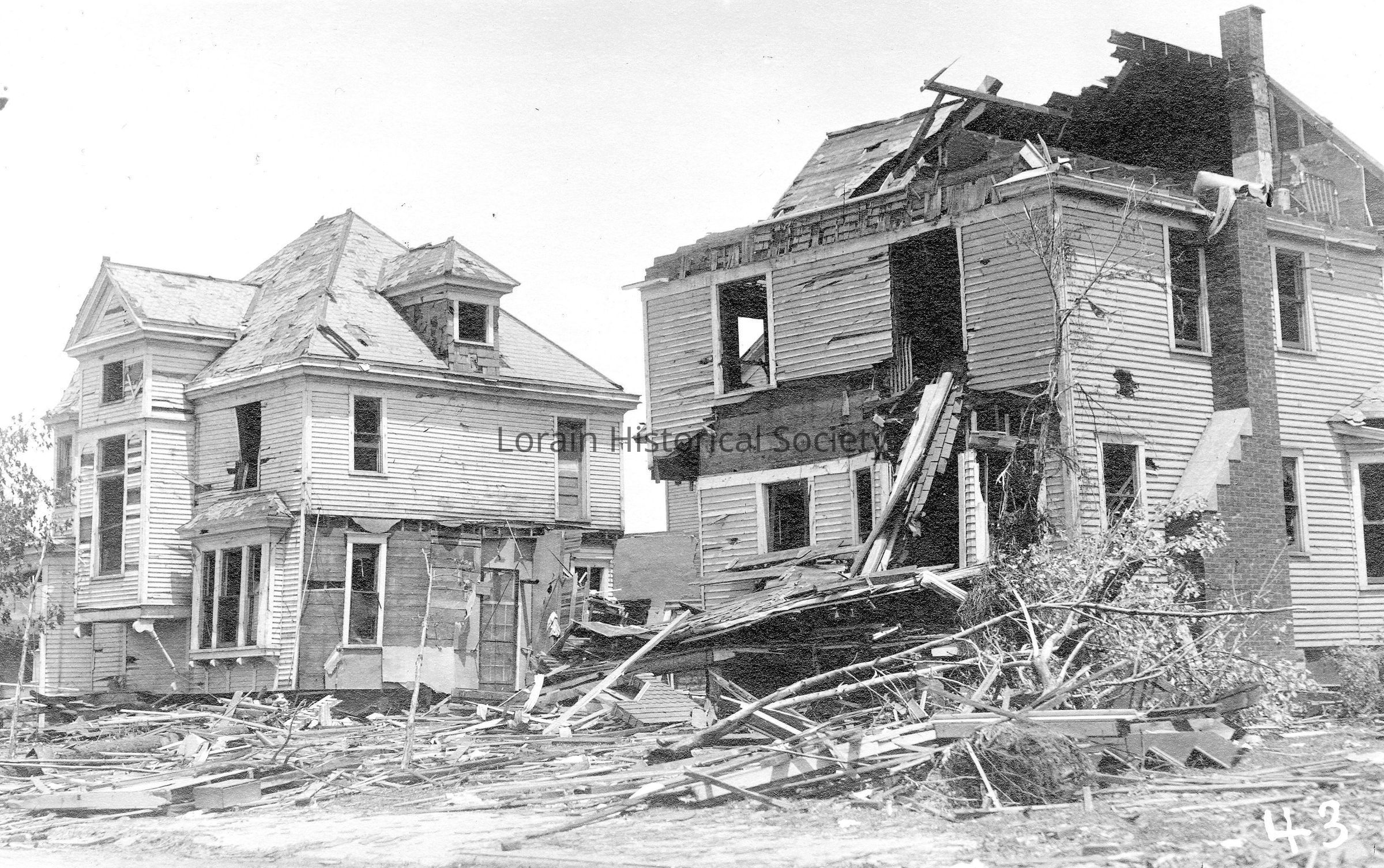 Photograph is black and white view of houses on West Fifth Street between Brownell Avenue and Oberlin Avenue, showing damage, destruction and debris from 1924 Tornado