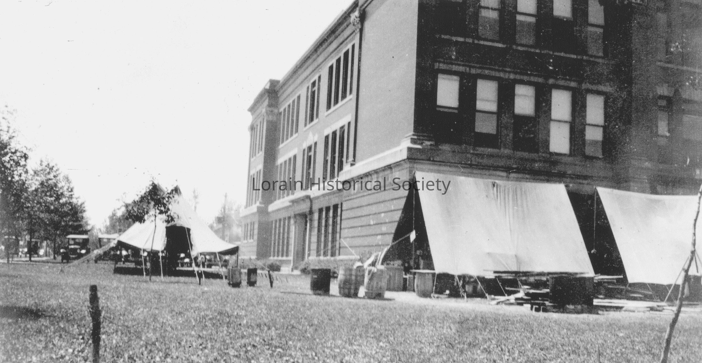 Photograph is black and white view of Lorain High School, 620 Washington Avenue, which was used as an emergency hospital for victims after the 1924 Tornado. Tents were erected in various locations around the high school to provide aid to tornado victims.Photograph Details