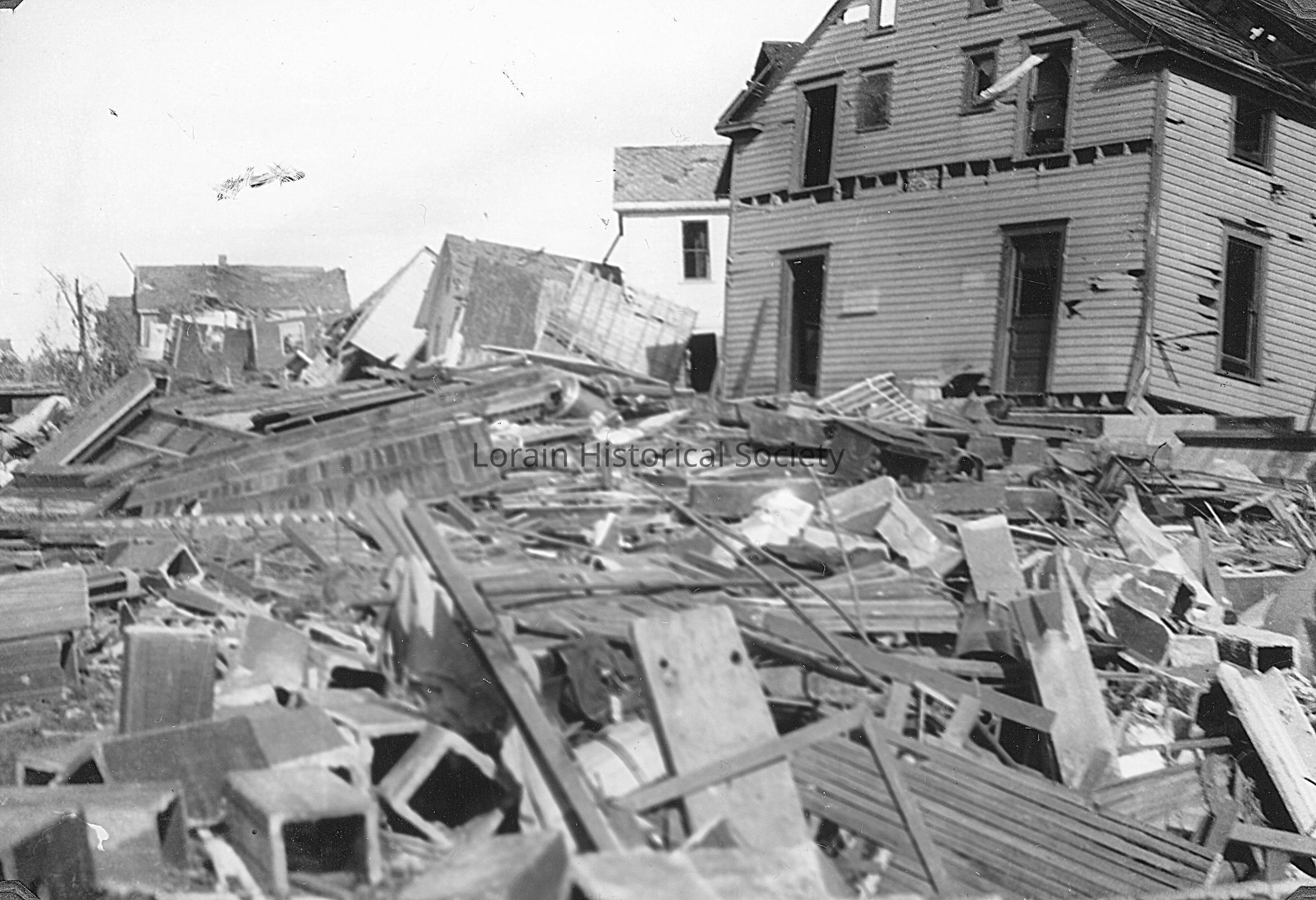Photograph is black and white view of unidentified houses showing damage, destruction and debris from 1924 Tornado.