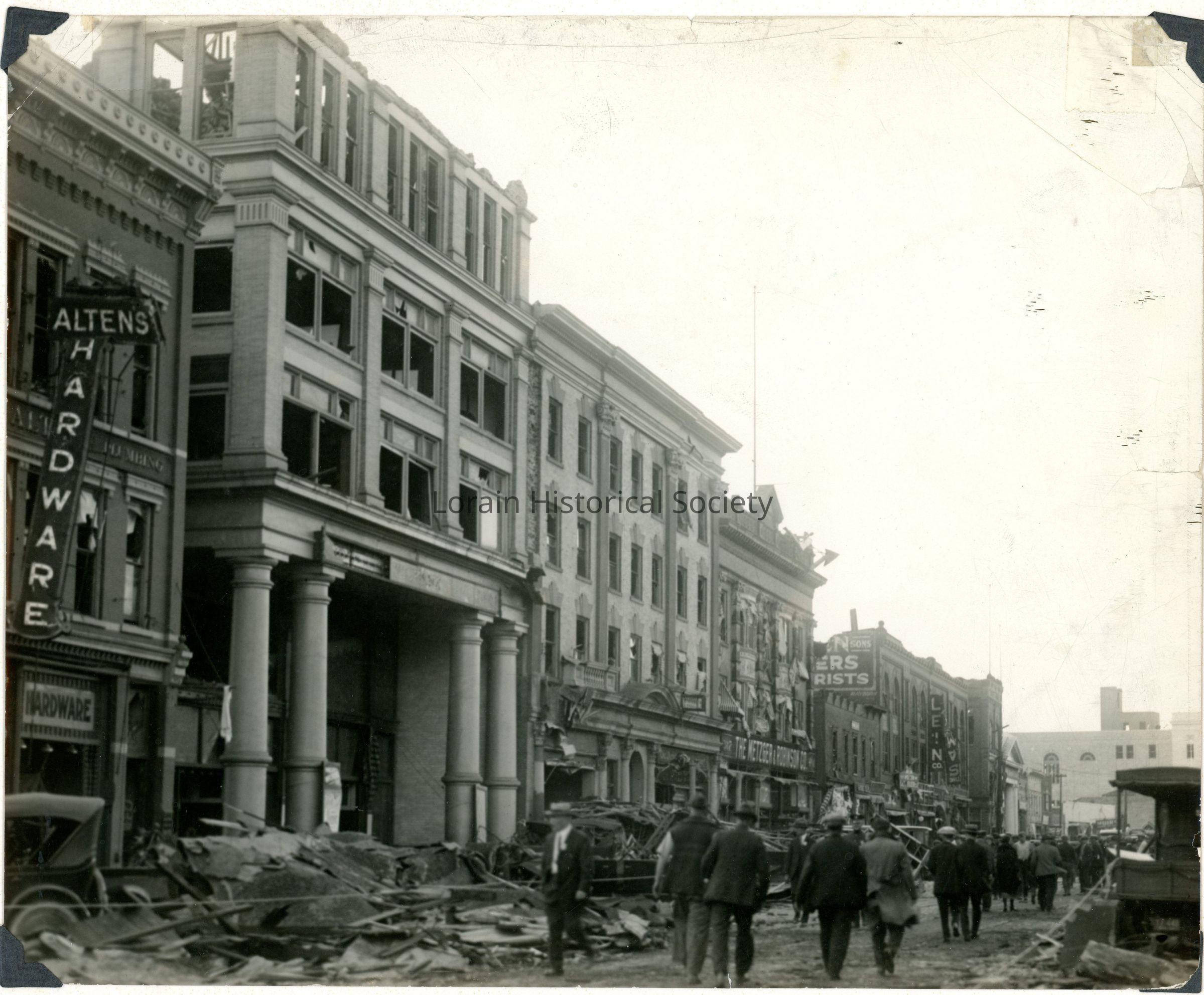 Photograph is black and white view of Broadway looking South from West 4th Street showing damage and destruction from 1924 Tornado. L to R: Alten Hardware, 353-359 Broadway; Wickens Building, 361-371 Broadway; State Theatre, 375 Broadway; Cleveland Trust Building, 383 Broadway; Metzger and Robinson Building, 385-401 Broadway (Duane Block).Acquisition