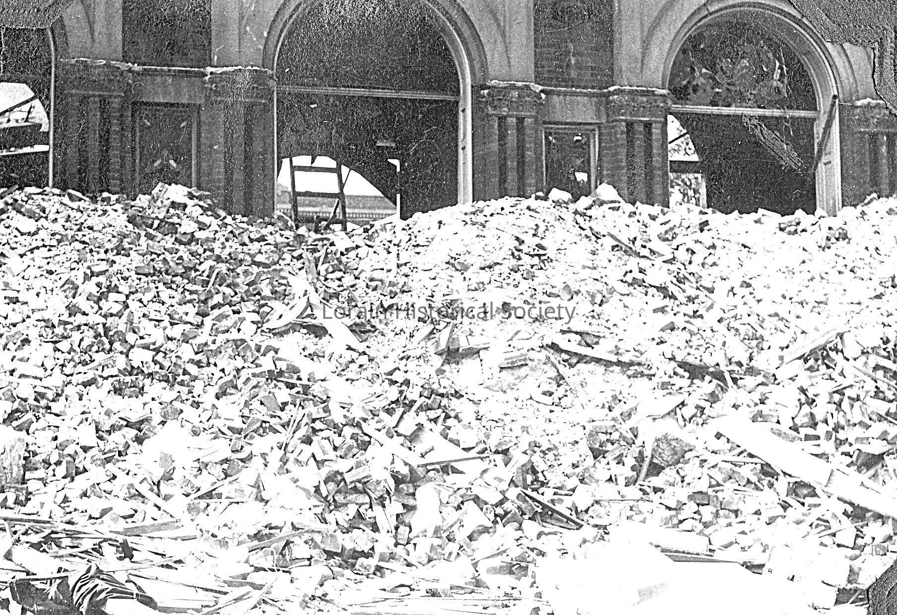 Written on back of photograph: "Tornado Ruins Front Steps of St. Mary's, Lorain 94:10".Photograph Details