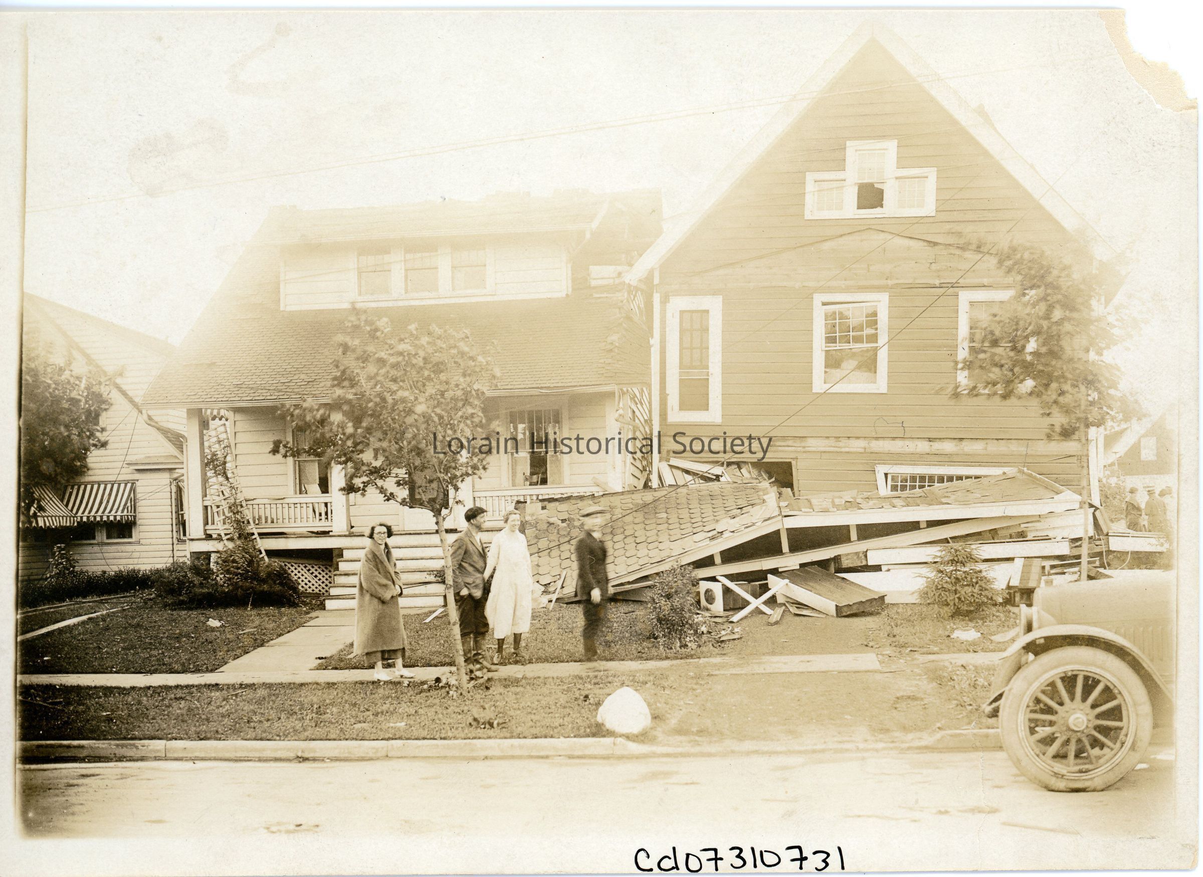 Photograph is black and white photo of houses on Oberlin Avenue (just south of West Seventh Street) showing damage from 1924 Tornado. L to R: 713 Oberlin Avenue, Blanche and Charles A. Smith Home; 719 Oberlin Avenue, Catherine W. and Harry L. Hawk Home.Acquisition