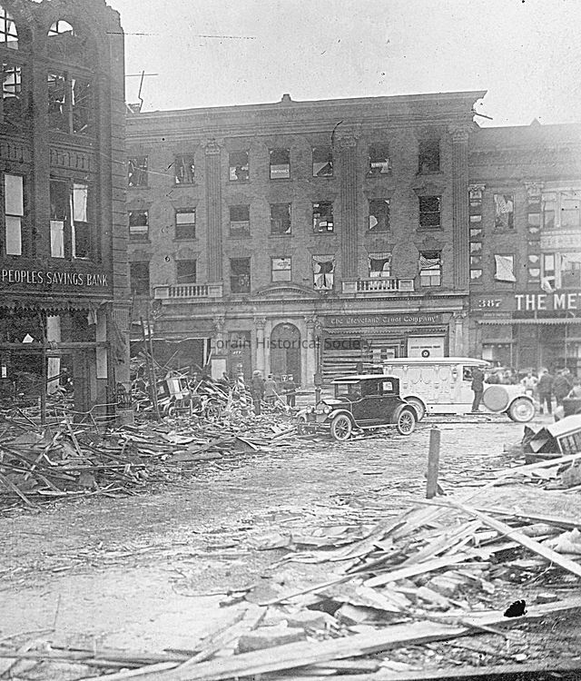 Photograph is black and white view of The Peoples Savings Bank, 374 Broadway (foreground), The Cleveland Trust Co., 383 Broadway and The Metzger & Robinson Building, 385-401 Broadway (background) showing damage, destruction and debris from 1924 Tornado.Photograph Details
