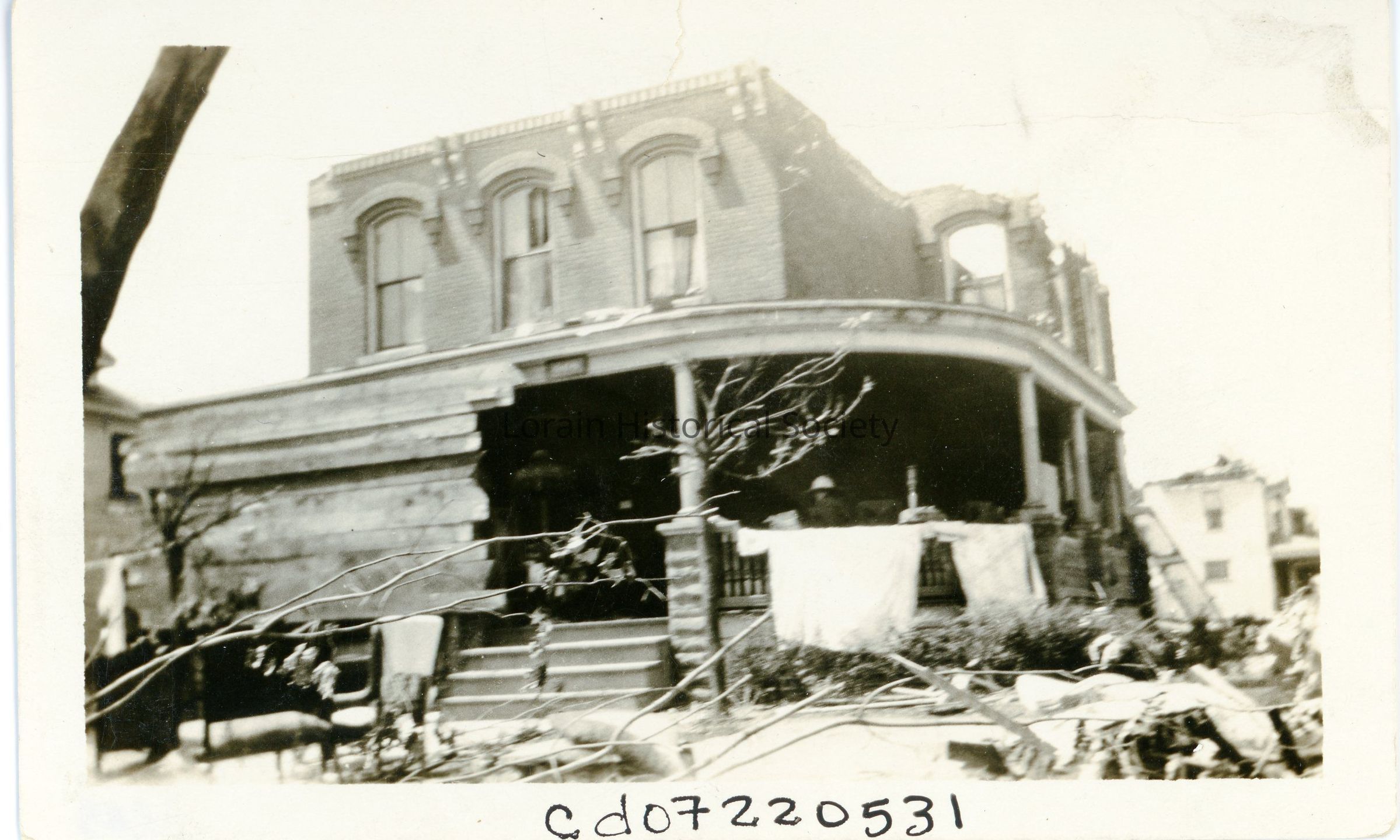 Photograph is black and white view of 608 Hamilton Avenue, Emma and Dr. Henry Felix home, showing damage and destruction from 1924 Tornado. This home was built in 1900 and is no longer standing.Acquisition
