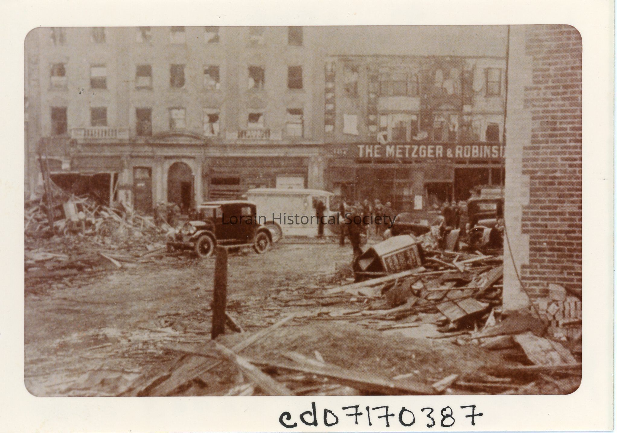 Photograph is black and white view of buildings on Broadway showing damage, destruction and debris from 1924 Tornado. L to R: The Cleveland Trust Co., 383 Broadway; The Metzger & Robinson Building, 385-401 Broadway.Acquisition