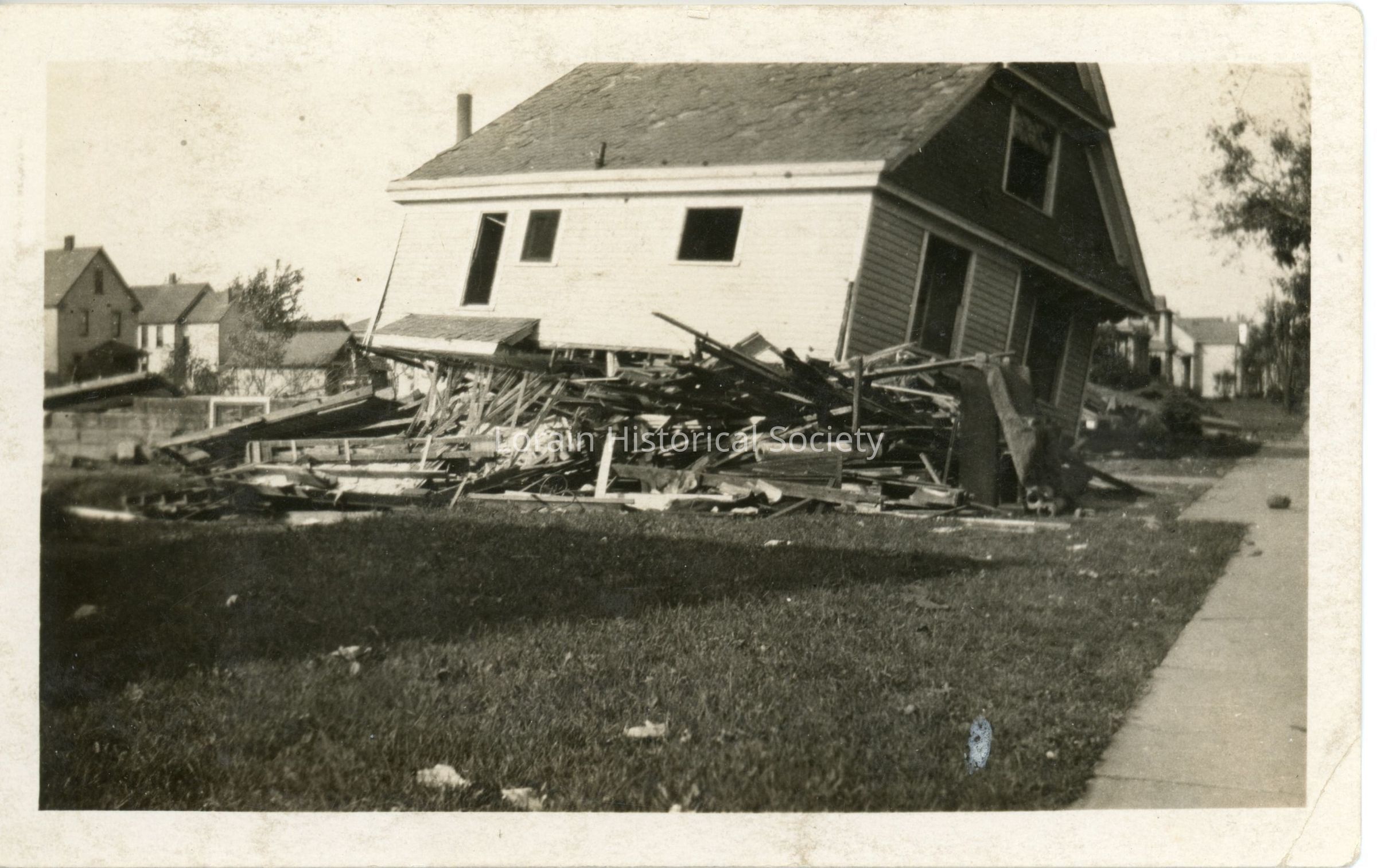 Photograph is black and white view of unidentified house sitting at an angle showing damage and destruction from 1924 Tornado. The pile of debris sitting next to it is from the house next door which was completely destroyed.Acquisition