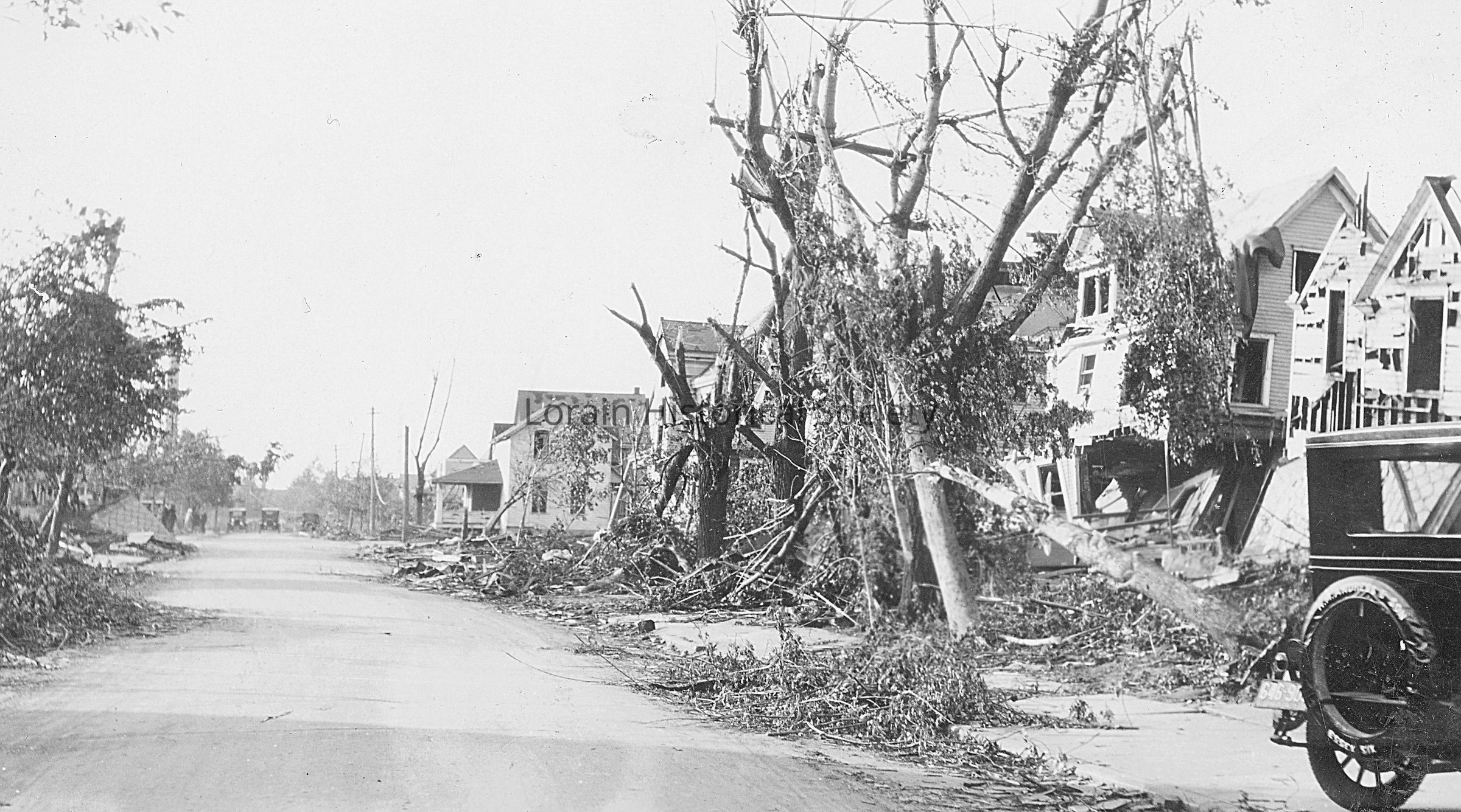 Photograph is black and white view of houses on Hamilton Avenue showing damage, destruction and debris from 1924 Tornado.Photograph Details