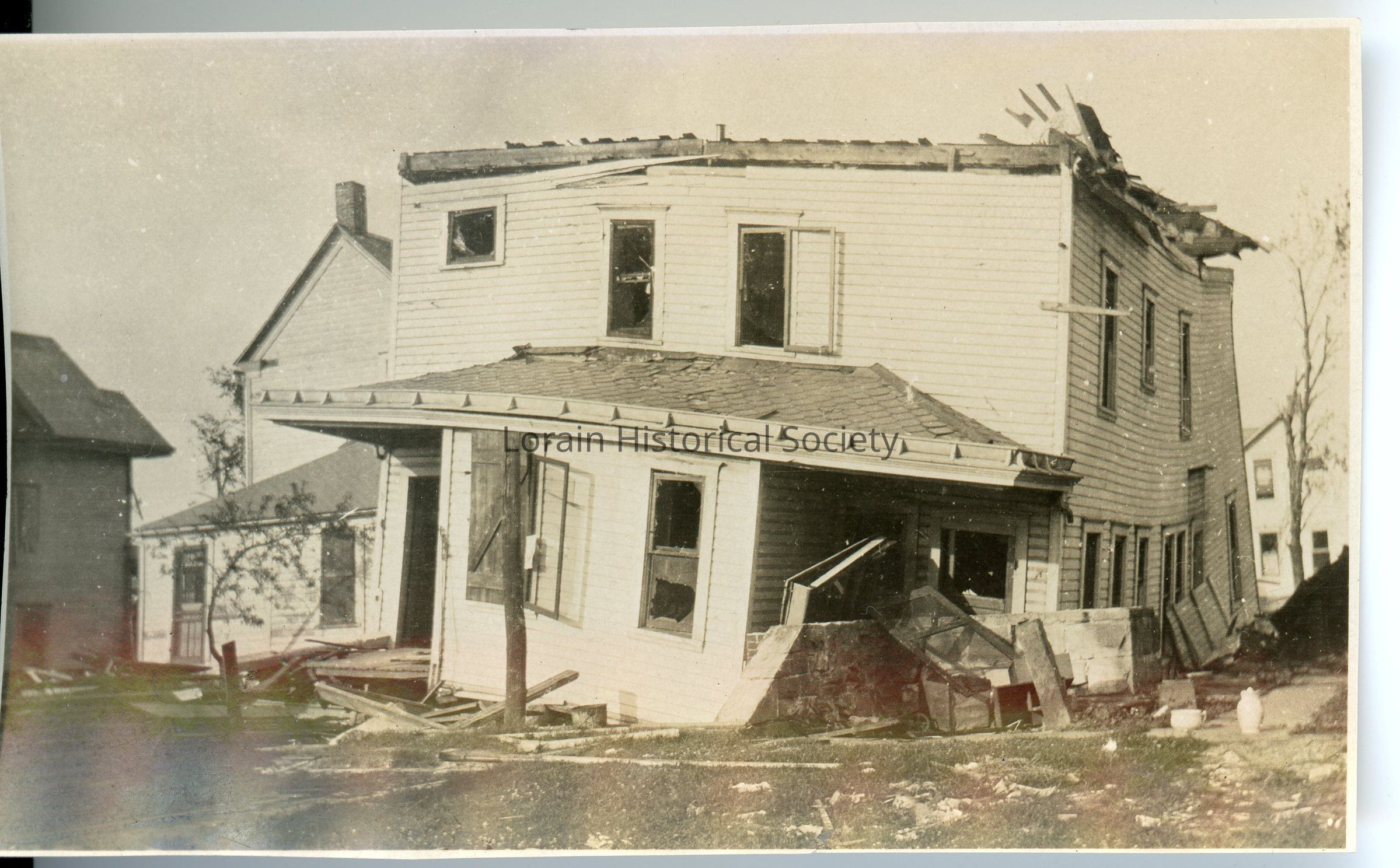 Photograph is black and white view of unidentified house showing damage and destruction from 1924 Tornado.Acquisition