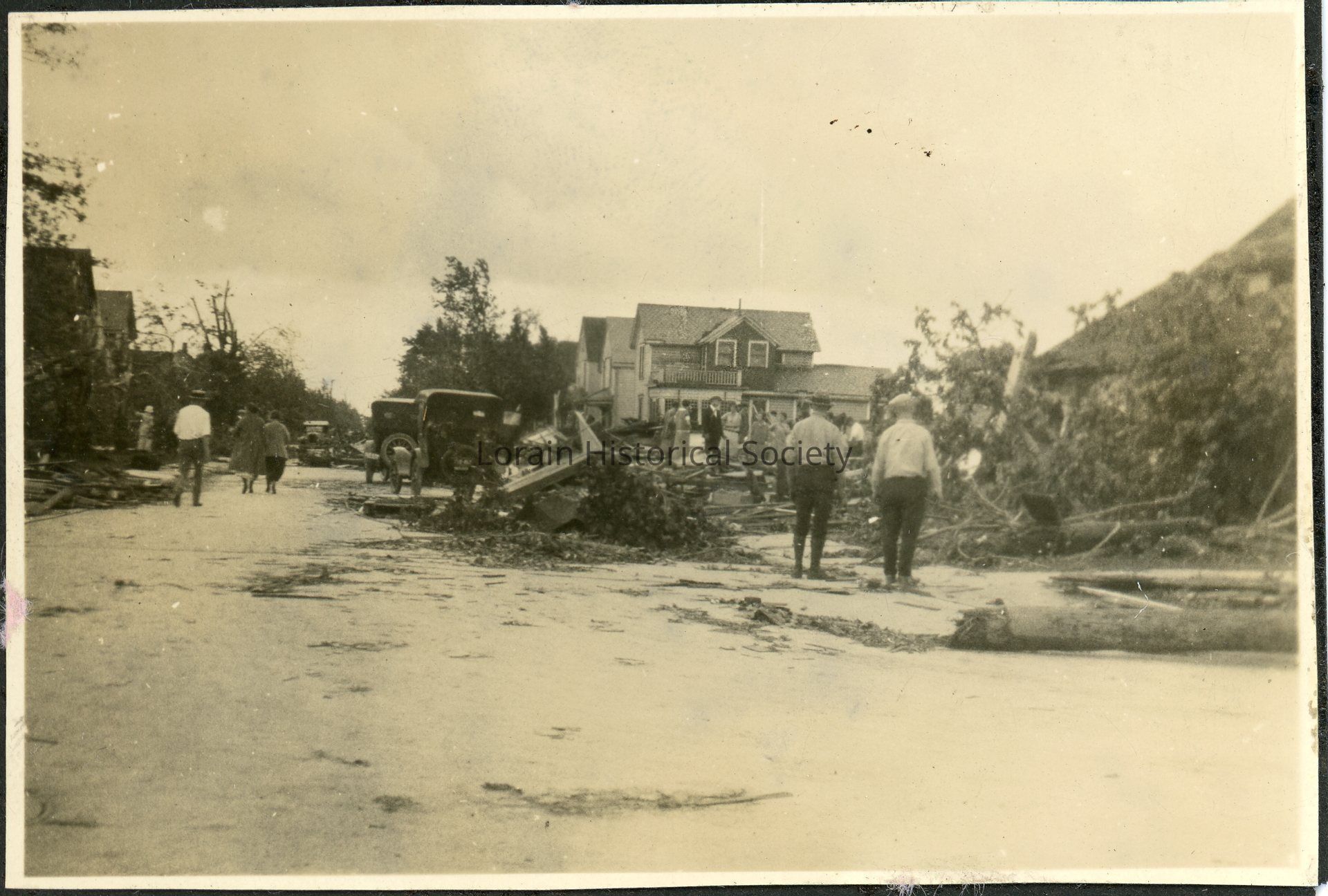 Photograph is black and white view of houses on Brownell Avenue, showing damage, destruction and debris from 1924 Tornado. L to R: 644 Brownell Avenue, Amelia Rader (widow, Joseph) Home; 636 Brownell Avenue, Mayme and George Yingling Home; 628 Brownell Avenue, Mazie and John W. Price Home; 618 Brownell Avenue, Mary E. and William S. Connors Home; 1301 West Sixth Street, Dewight Jones Home.